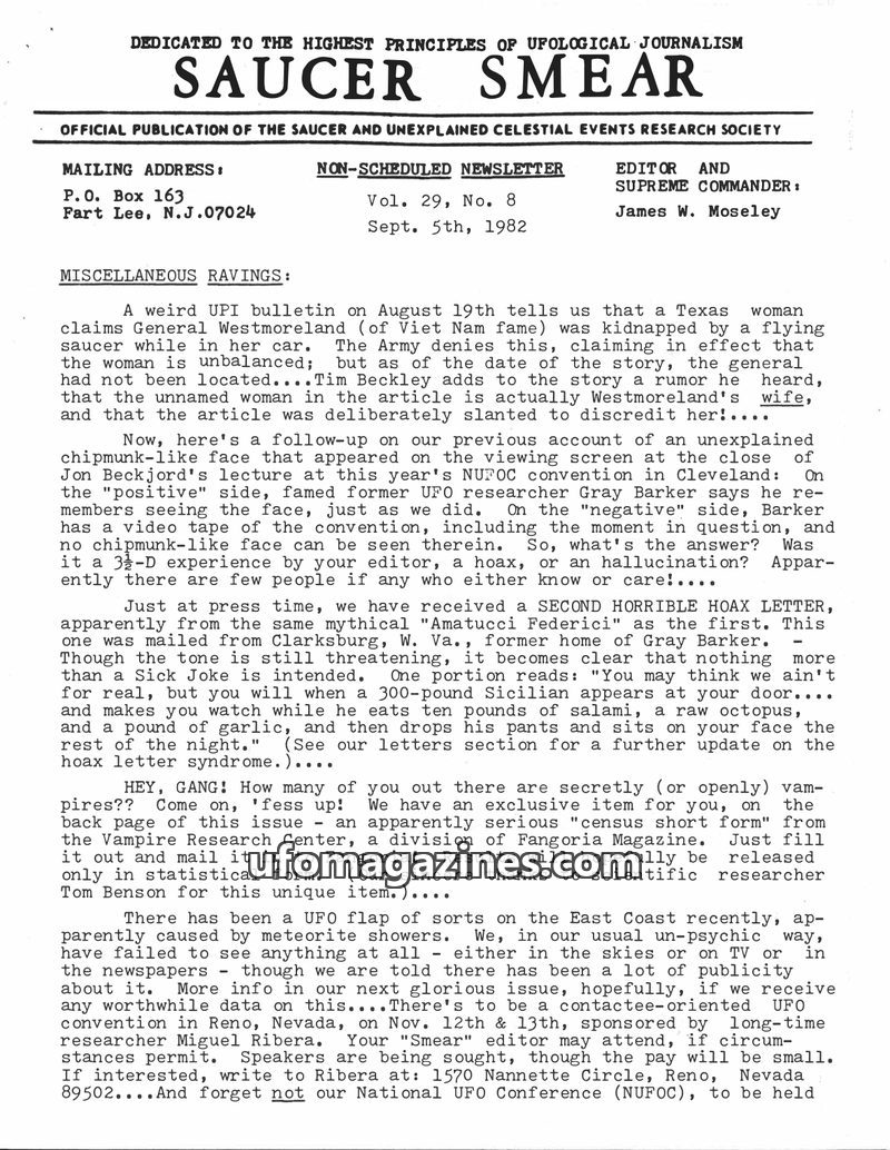 This issue of Saucer Smear covers a variety of UFO-related topics, including a report of General Westmoreland's alleged abduction, a mysterious chipmunk-like face at a convention,