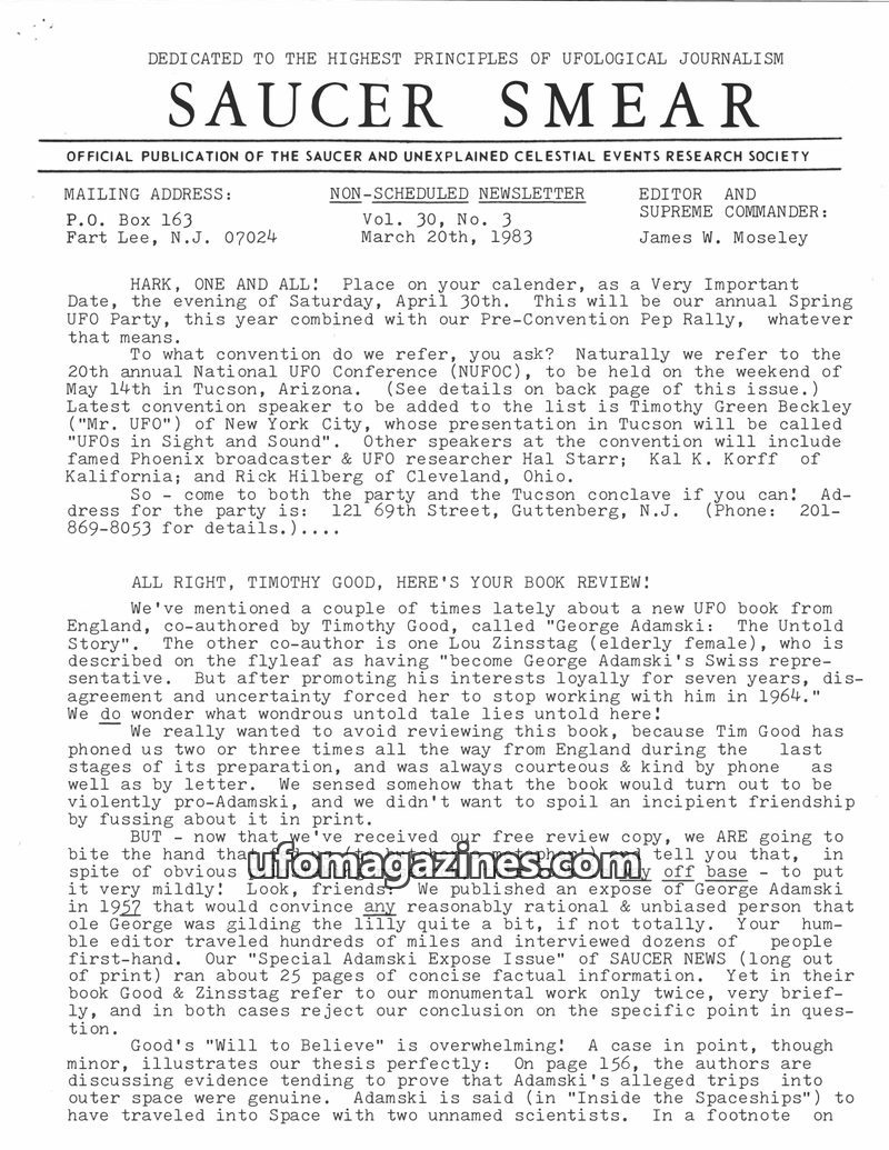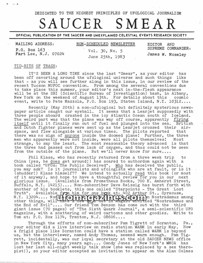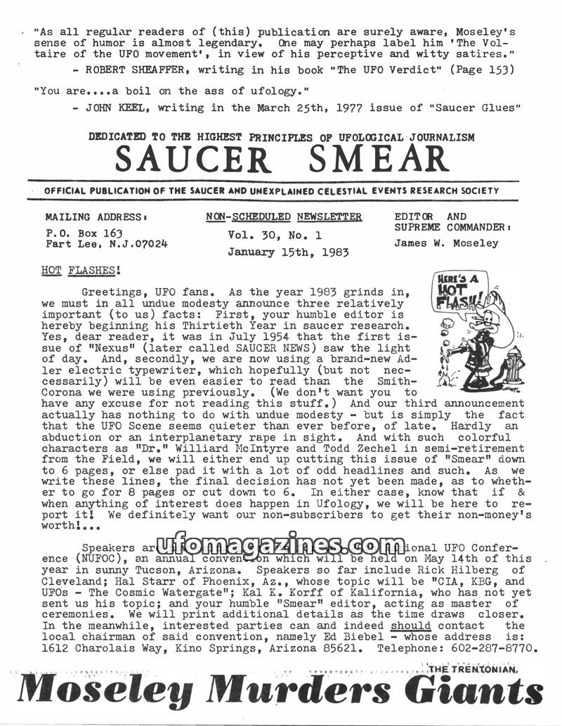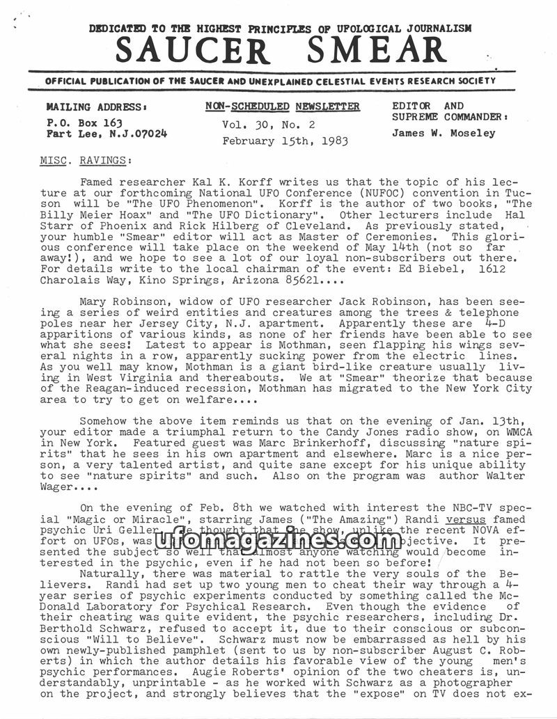 This issue of Saucer Smear, dated January 15, 1983, marks editor James W. Moseley's 30th year in UFO research. It announces the upcoming 20th National UFO Conference in Tucson, Ari