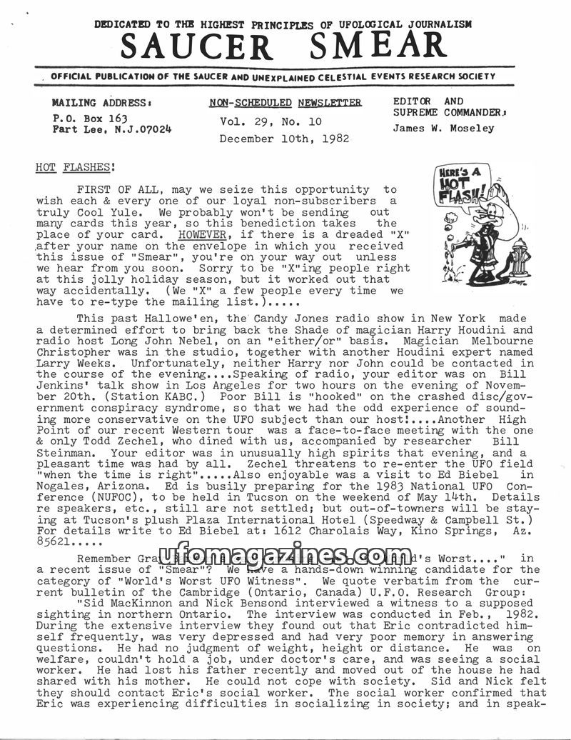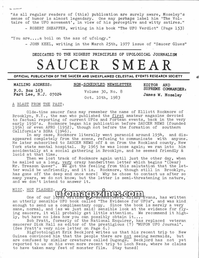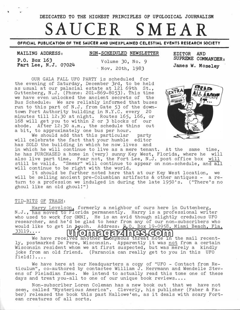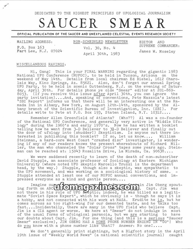 This issue of Saucer Smear, dated January 15, 1983, marks editor James W. Moseley's 30th year in UFO research. It announces the upcoming 20th National UFO Conference in Tucson, Ari