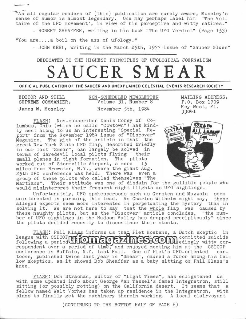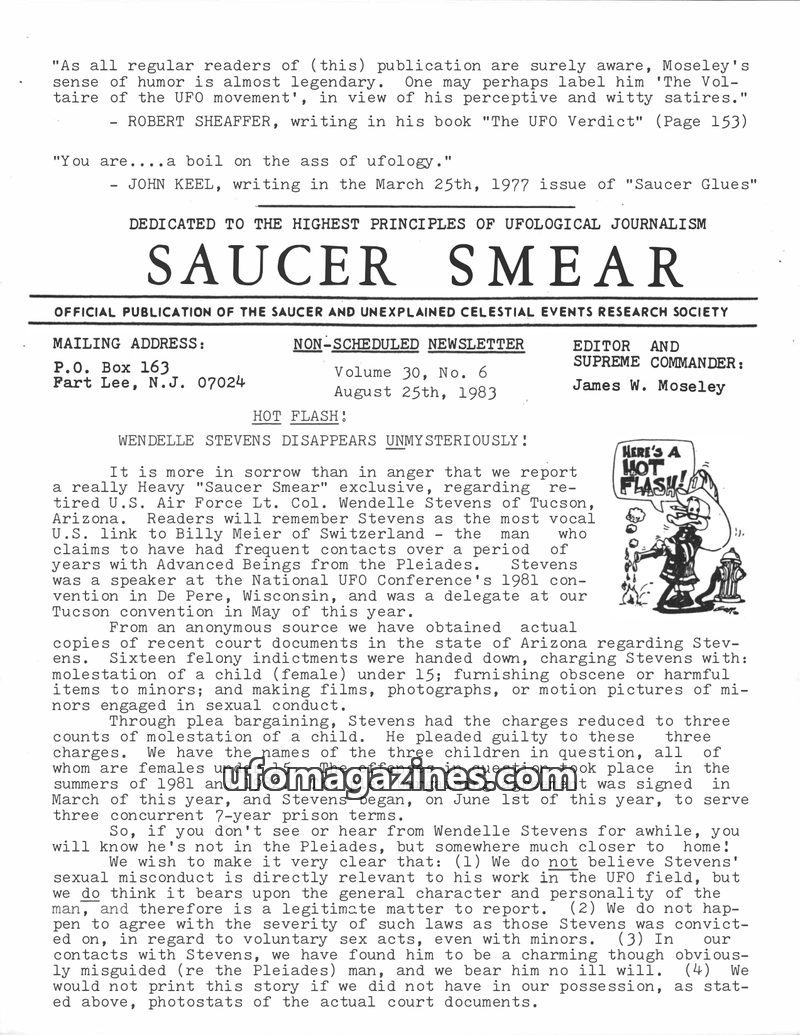 This issue of Saucer Smear reports on the legal troubles of Lt. Col. Wendelle Stevens, who was convicted of child molestation and sentenced to prison. It also reviews Philip Klass'