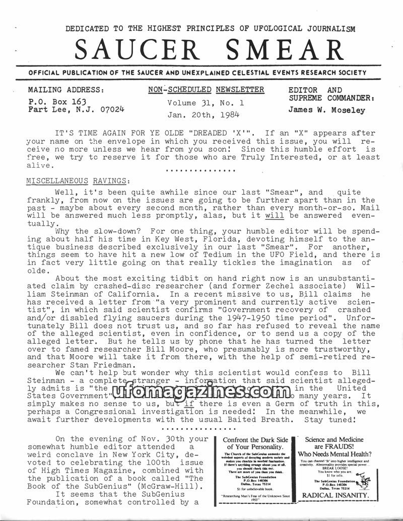 This issue of Saucer Smear, dated January 20, 1984, discusses a slowdown in publication frequency due to the editor's antique business and a perceived lull in UFO news. A significa
