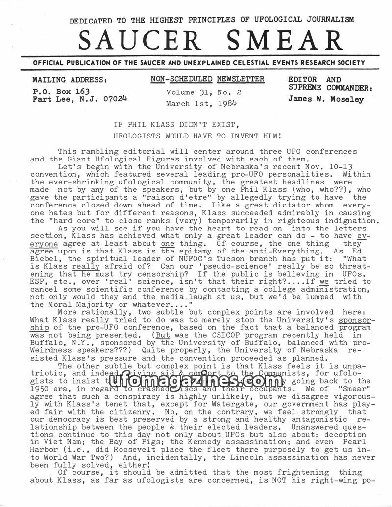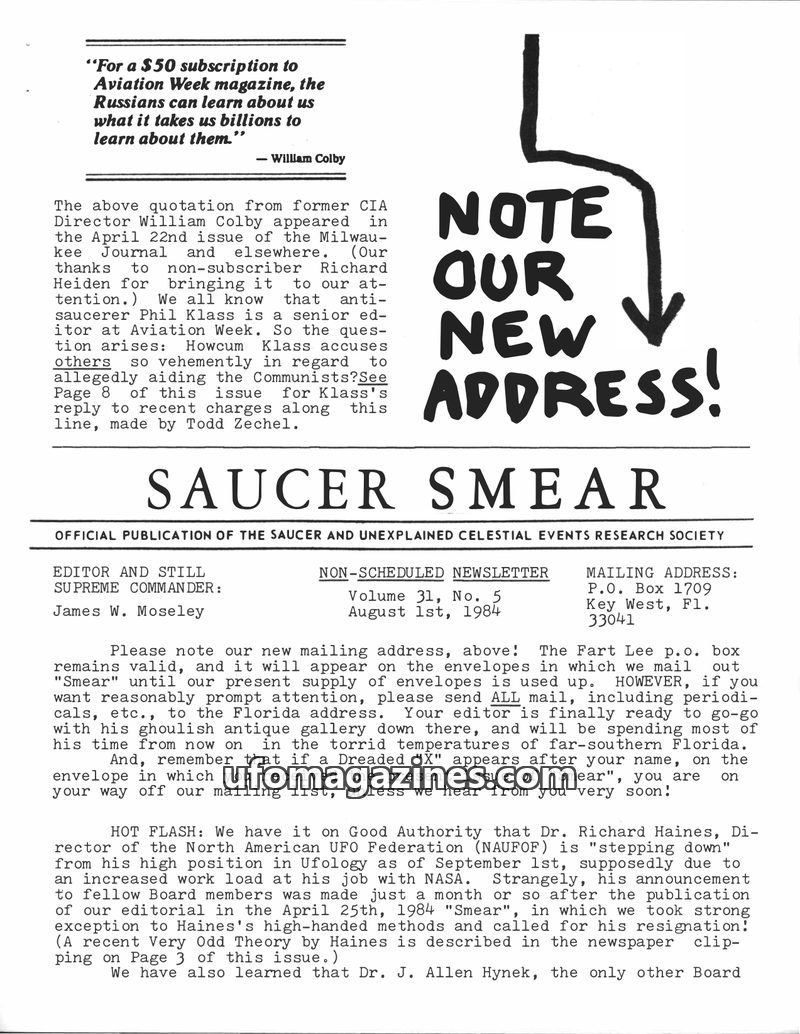This issue of SAUCER SMEAR, dated August 1, 1984, addresses a new mailing address for the publication and discusses several key topics in ufology. It includes a critique of Phil Kl