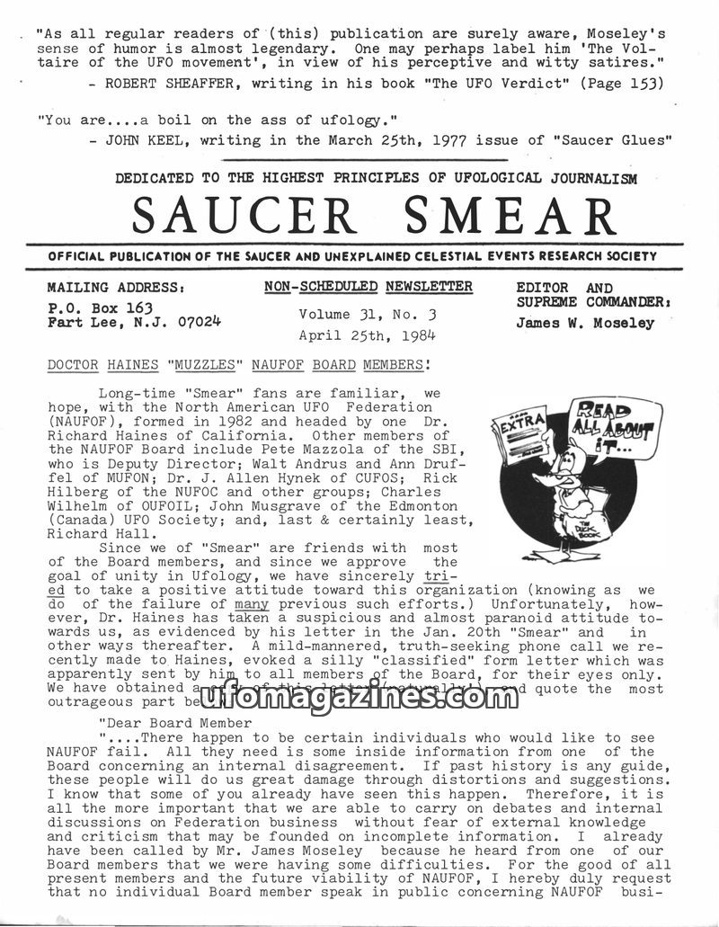 This issue of Saucer Smear, dated April 25, 1984, focuses on Dr. Richard Haines's alleged attempt to silence NAUFOF board members, as detailed in a letter obtained by the publicati