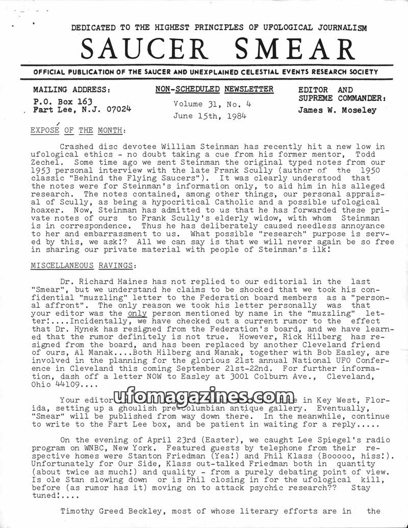 This issue of Saucer Smear, dated June 15, 1984, features an 'Expose of the Month' criticizing William Steinman's ufological ethics for sharing private interview notes. Miscellaneo