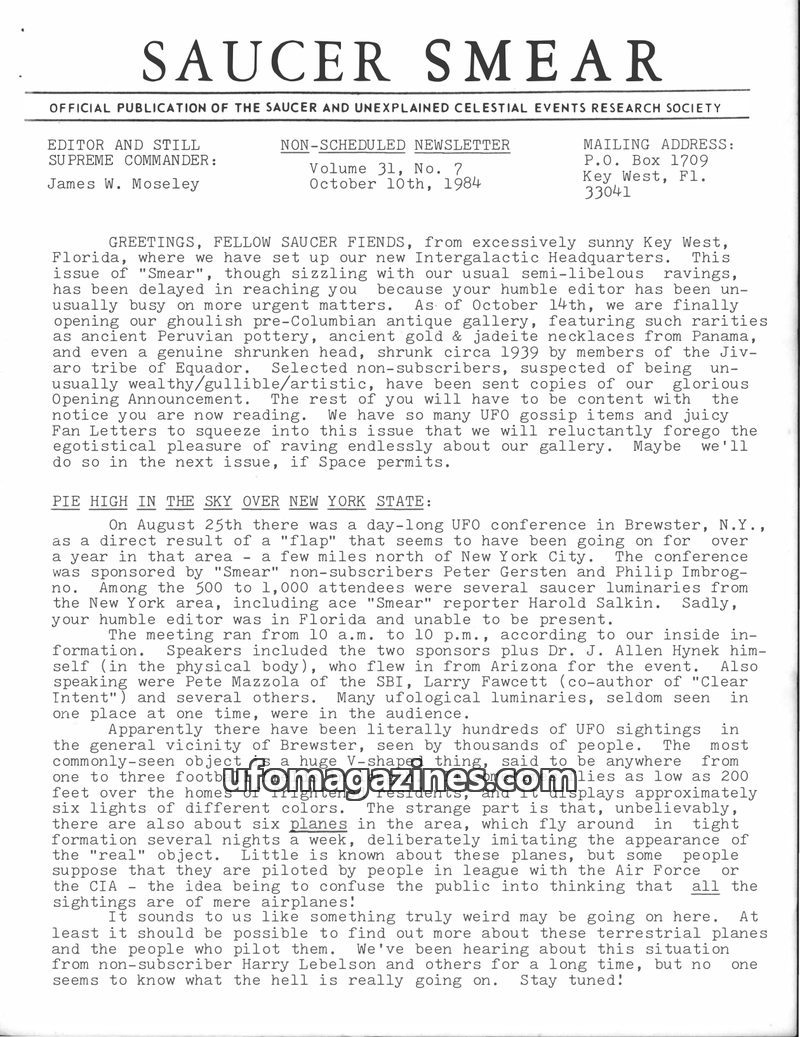 This issue of SAUCER SMEAR from October 10, 1984, covers a UFO conference in Brewster, NY, featuring reports of V-shaped UFOs and speculation about government-piloted planes. It al