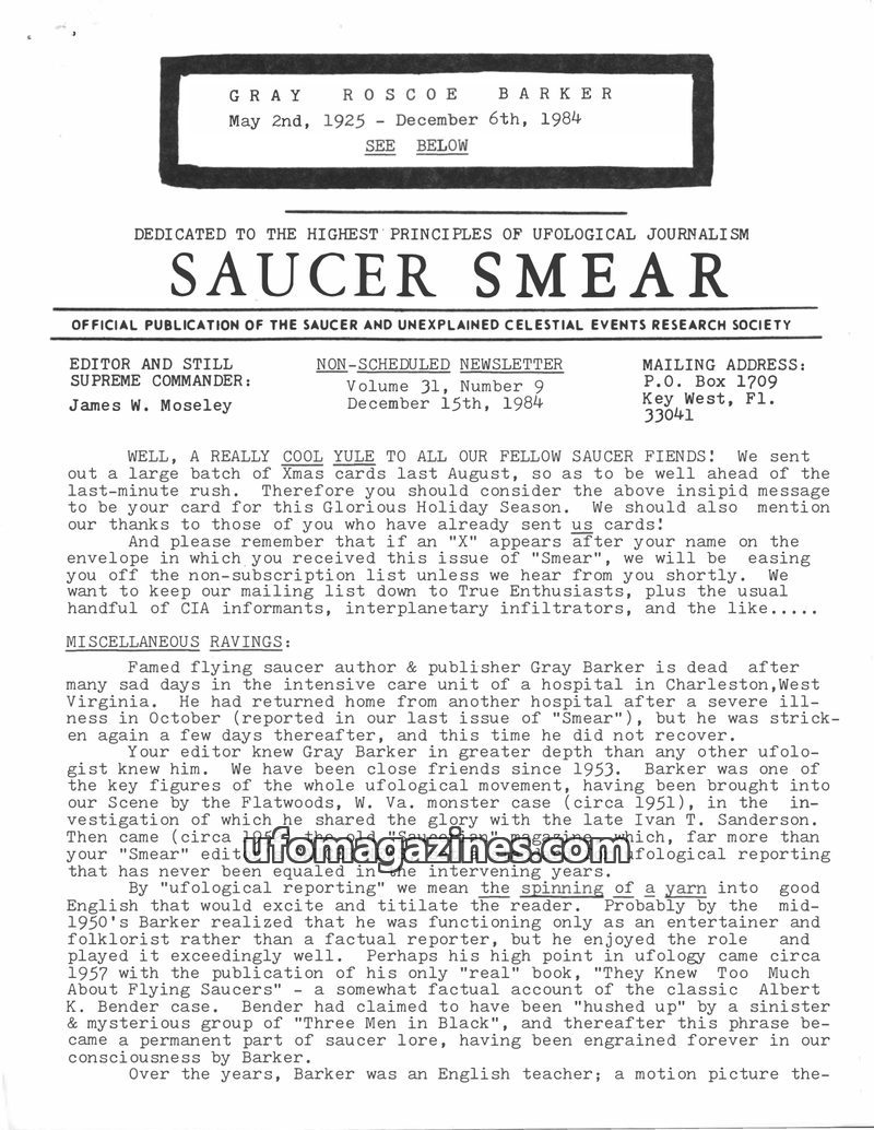 This issue of Saucer Smear, dated December 15th, 1984, leads with the obituary of Gray Barker, a significant figure in ufological journalism. The editor, James W. Moseley, reflects