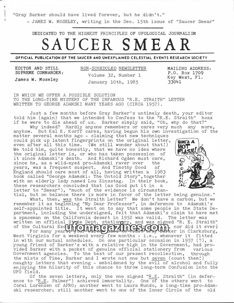 This issue of Saucer Smear focuses on the confession of a UFO hoax involving the R.E. Straith letter, which was sent to George Adamski in the 1950s. Editor James W. Moseley admits