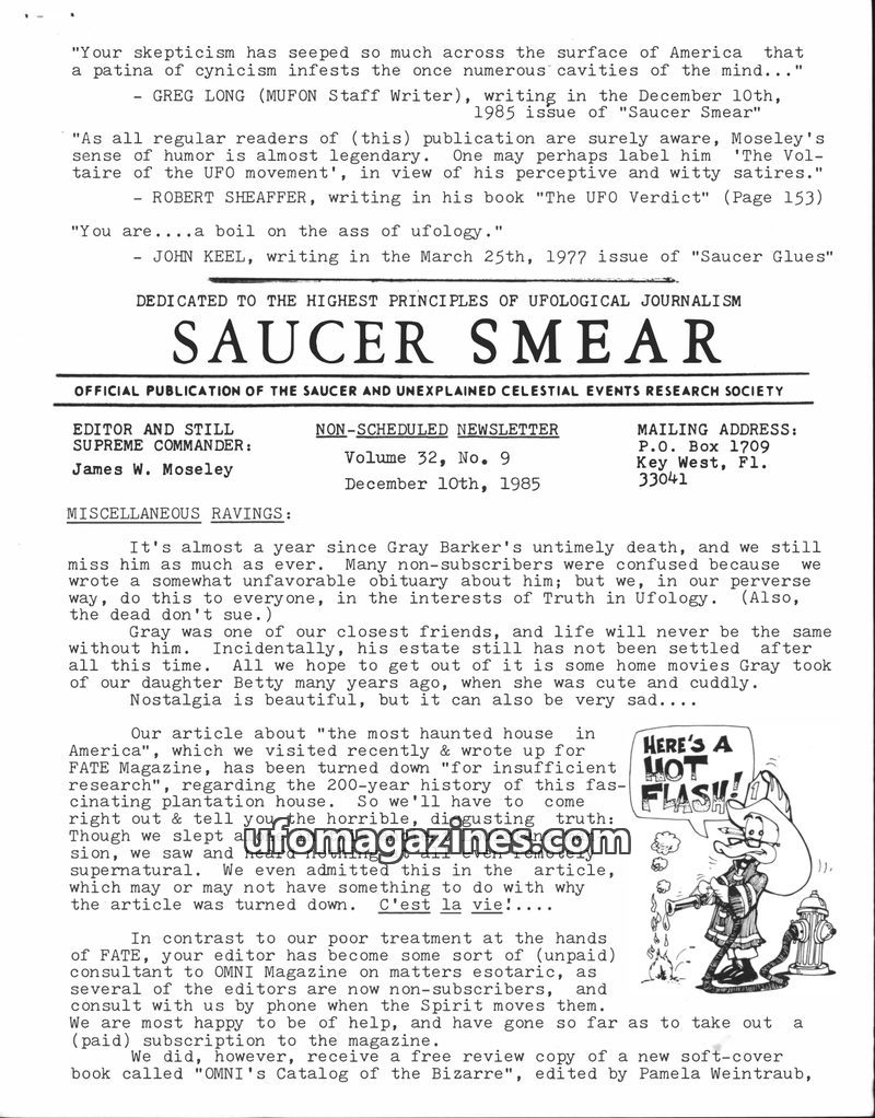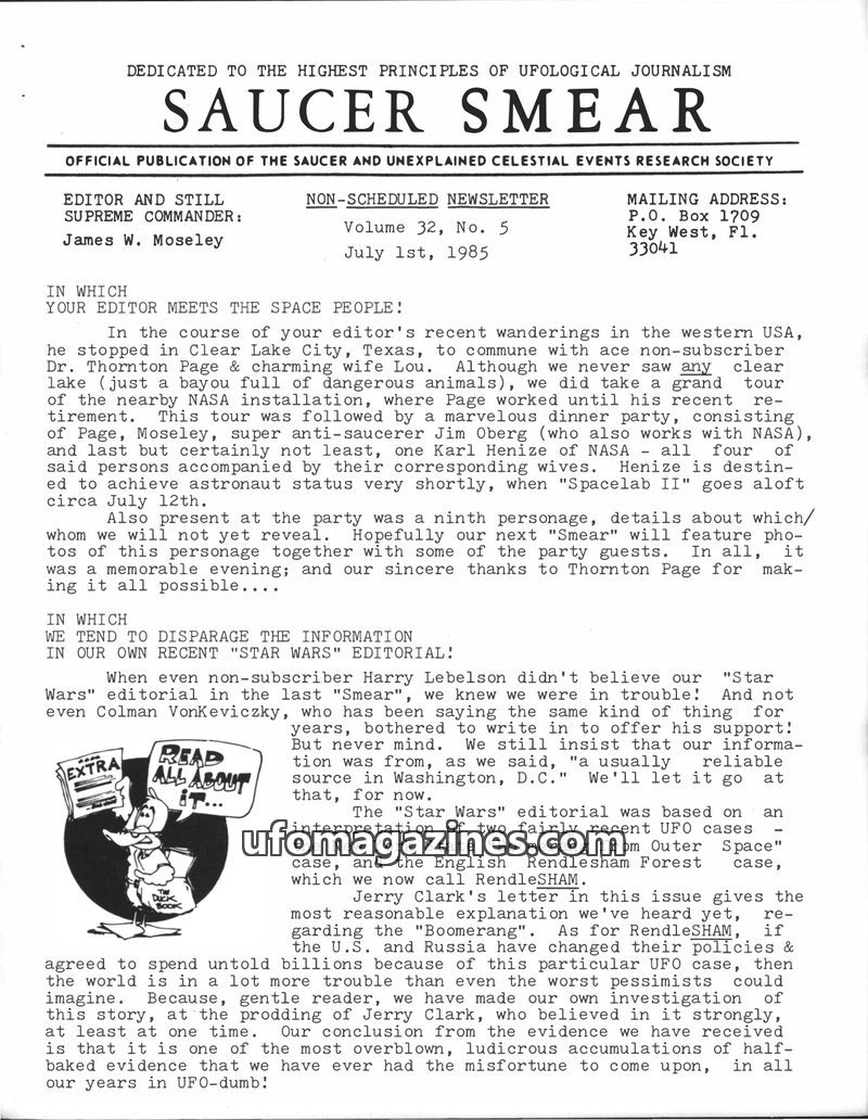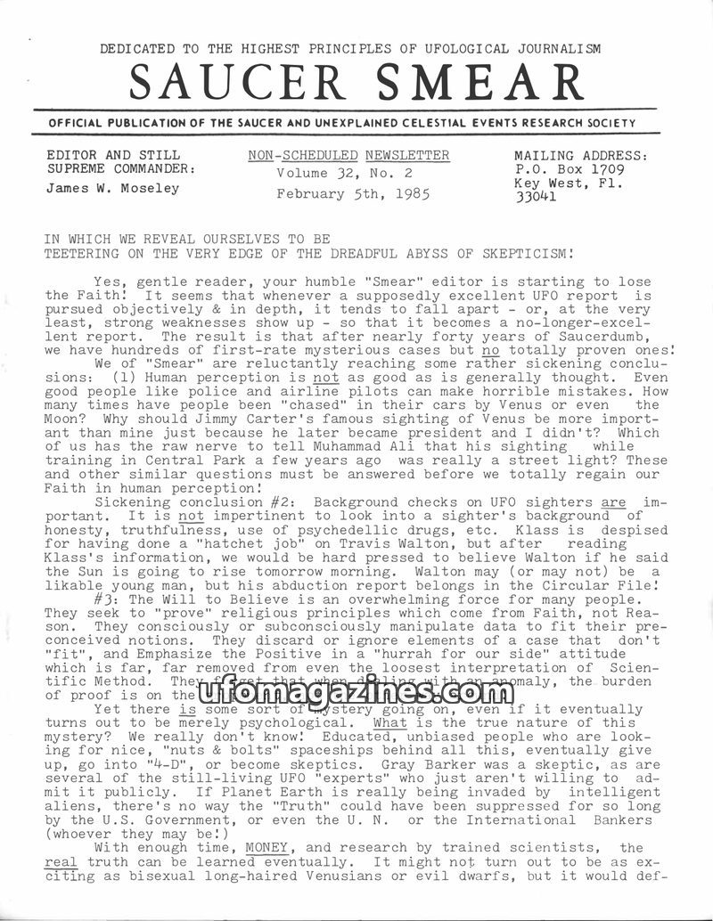 This issue of Saucer Smear, dated February 5, 1985, expresses a growing skepticism from editor James W. Moseley regarding the lack of proven UFO cases after decades of investigatio