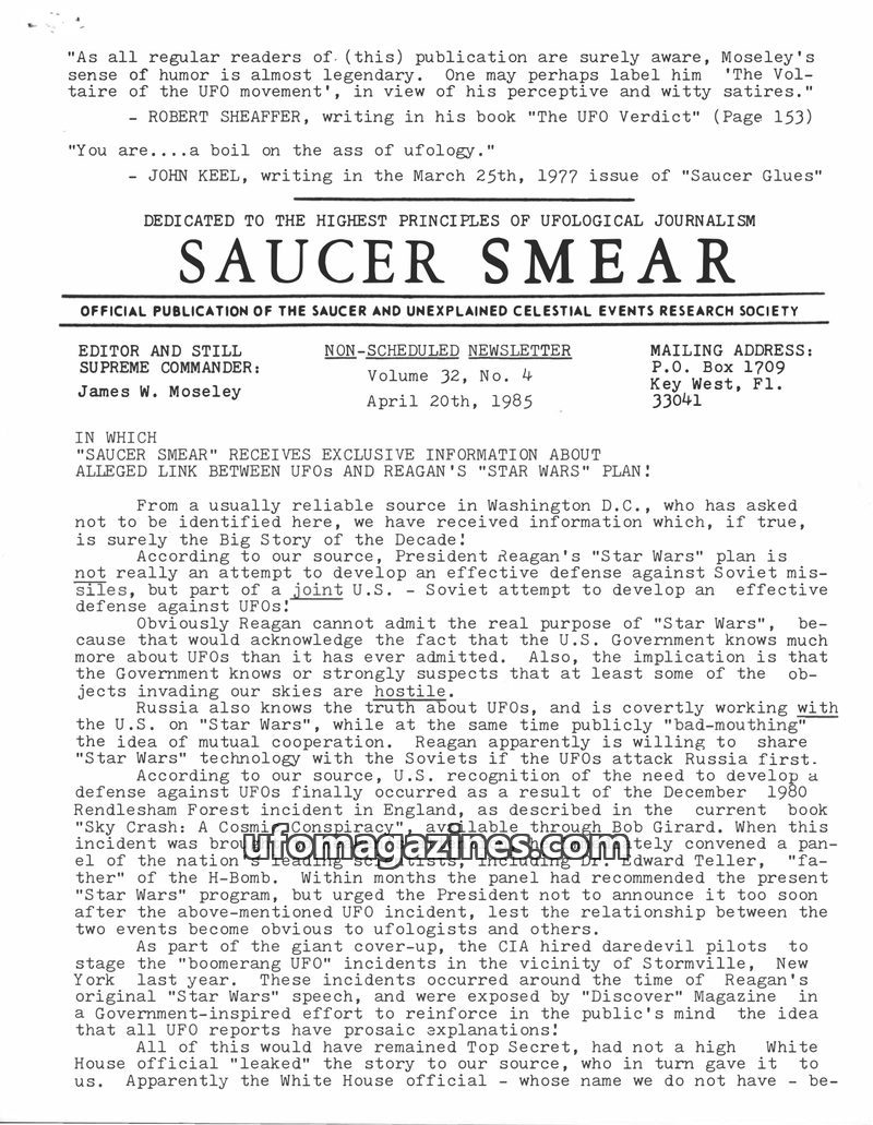 This issue of Saucer Smear reports exclusive information suggesting President Reagan's 'Star Wars' program is not for missile defense but a joint US-Soviet effort to counter UFOs.