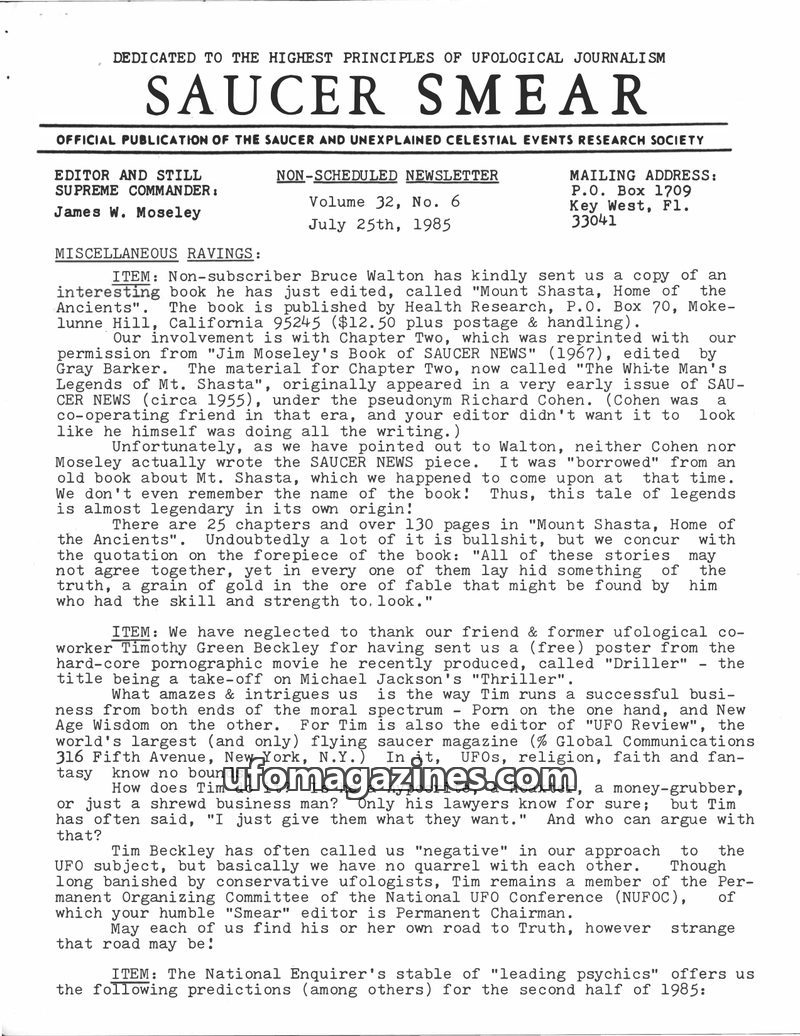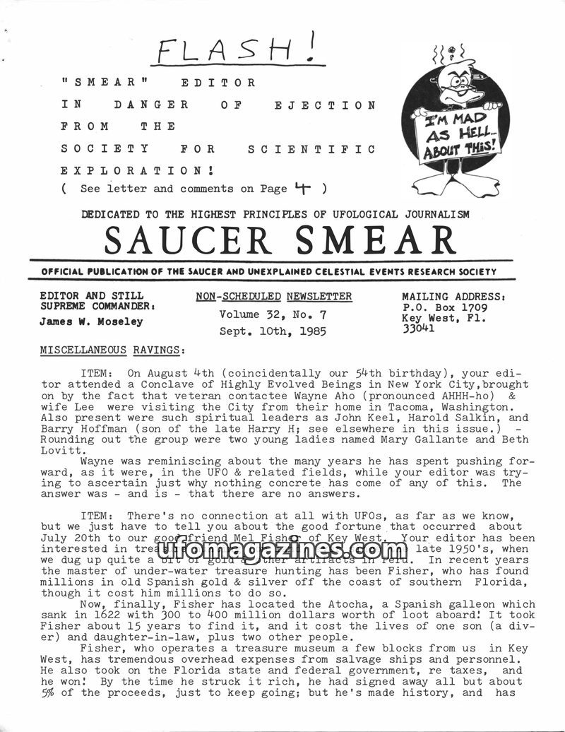 This issue of Saucer Smear, dated September 10, 1985, highlights editor James W. Moseley's perceived danger from the Society for Scientific Exploration. It features an account of M