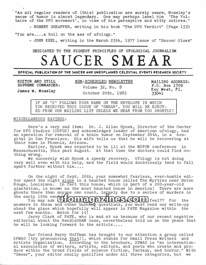 This issue of Saucer Smear reports on Dr. J. Allen Hynek's surgery for a brain tumor and his prior illness. The editor recounts a night spent in a famously haunted house in Louisia