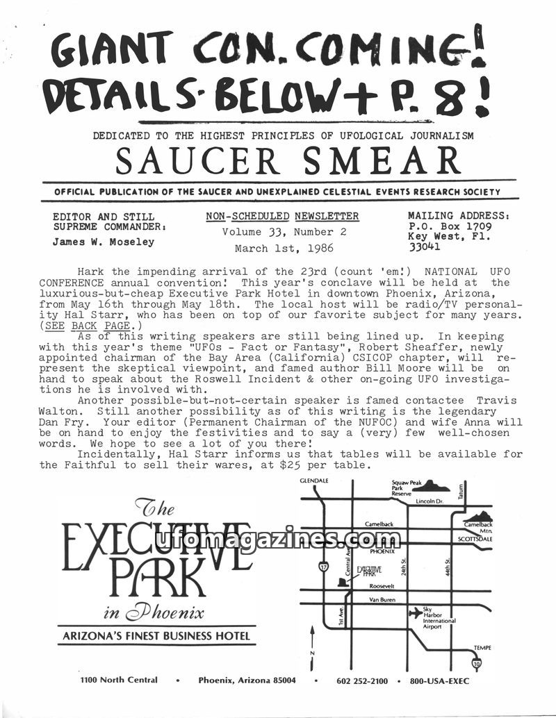 This issue of Saucer Smear announces the 23rd annual National UFO Conference in Phoenix, Arizona, from May 16-18, 1986, featuring speakers like Robert Sheaffer and Bill Moore. It d