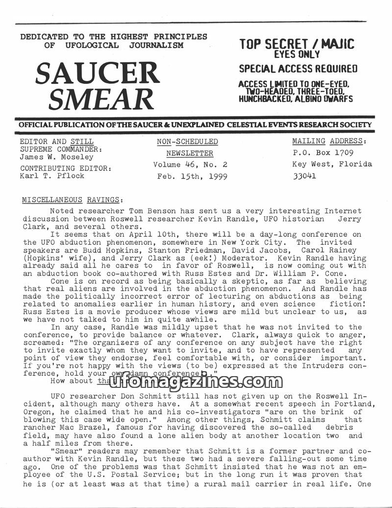 This issue of Saucer Smear covers a range of UFO-related topics, including an upcoming conference on abductions, ongoing research into the Roswell Incident by Don Schmitt, and a cr