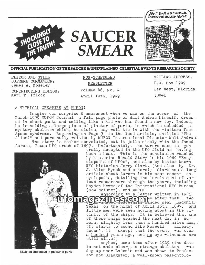 This issue of Saucer Smear focuses on the Aurora, Texas UFO crash of 1897 and a recently discovered skeleton embedded in plaster of paris, presented by MUFON Director Walt Andrus.