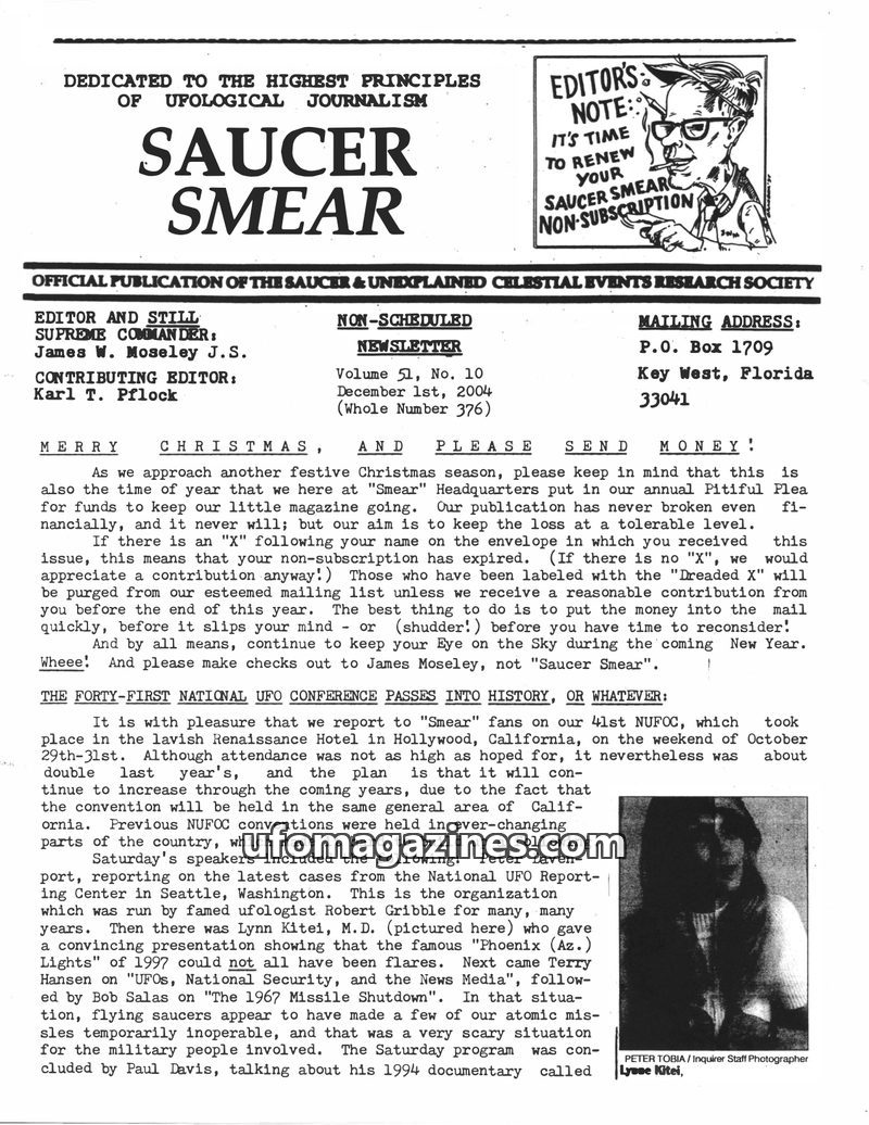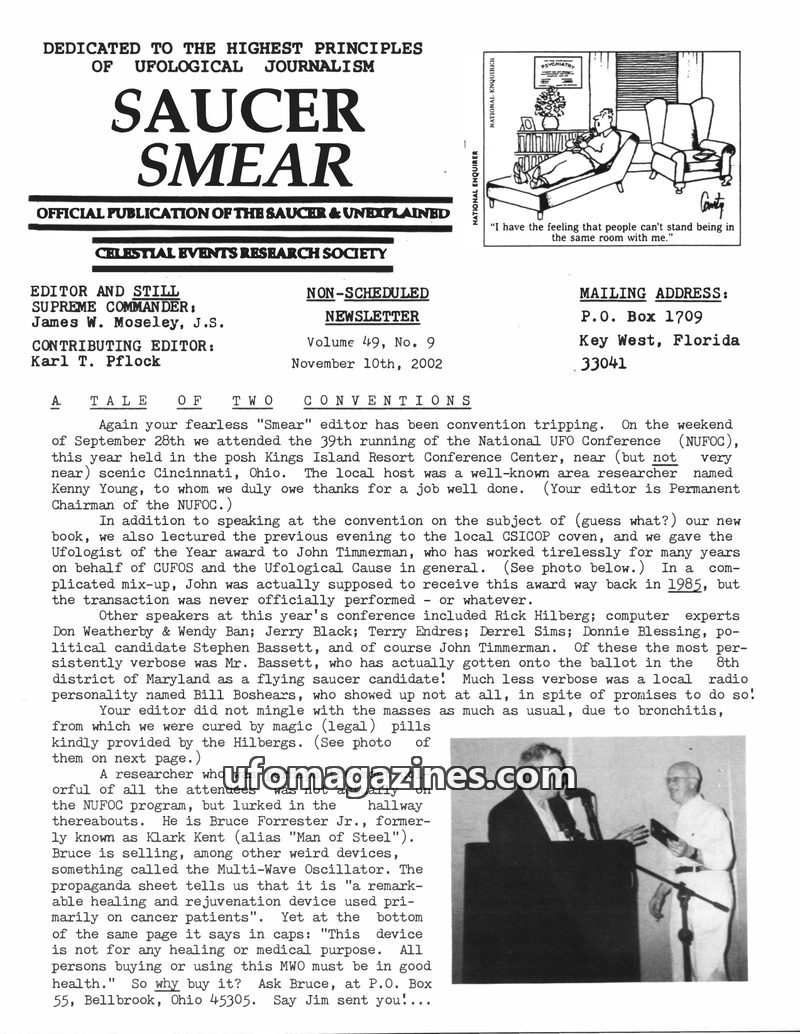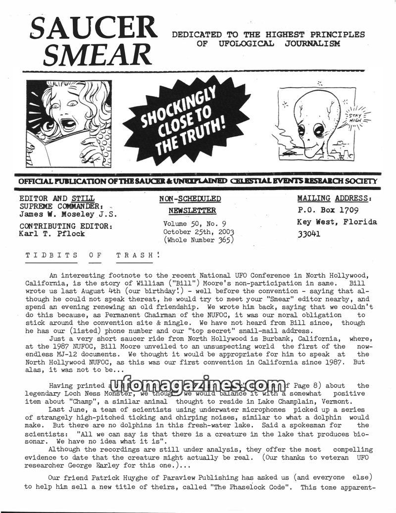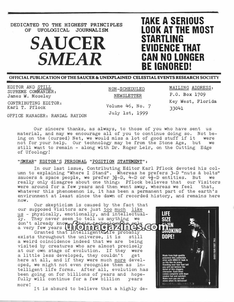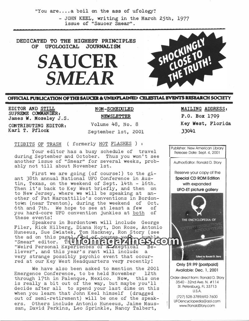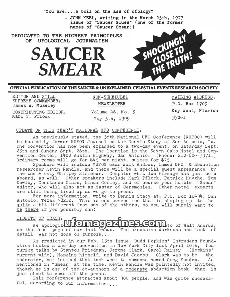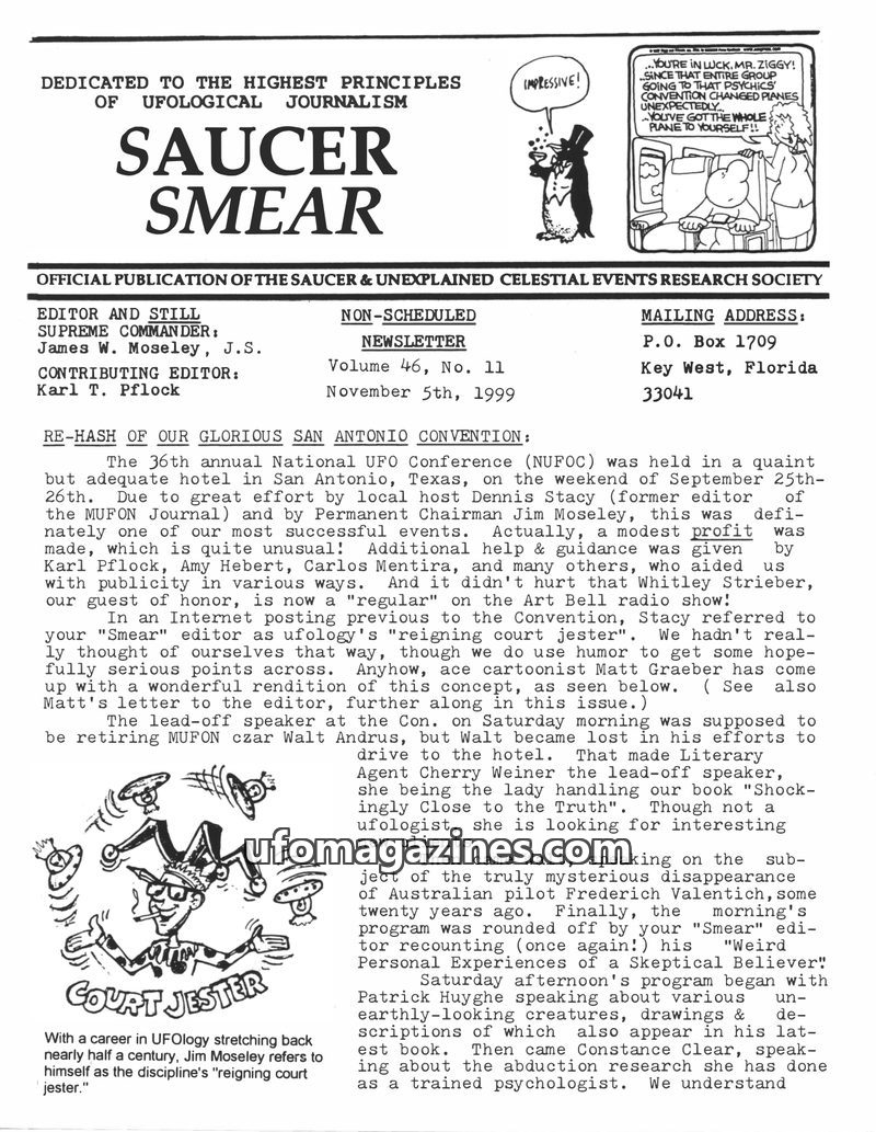 This issue of Saucer Smear covers a variety of topics within ufology, including a controversial UFO lecture in Key West, the ongoing legal actions of UFO activist Larry Bryant, and