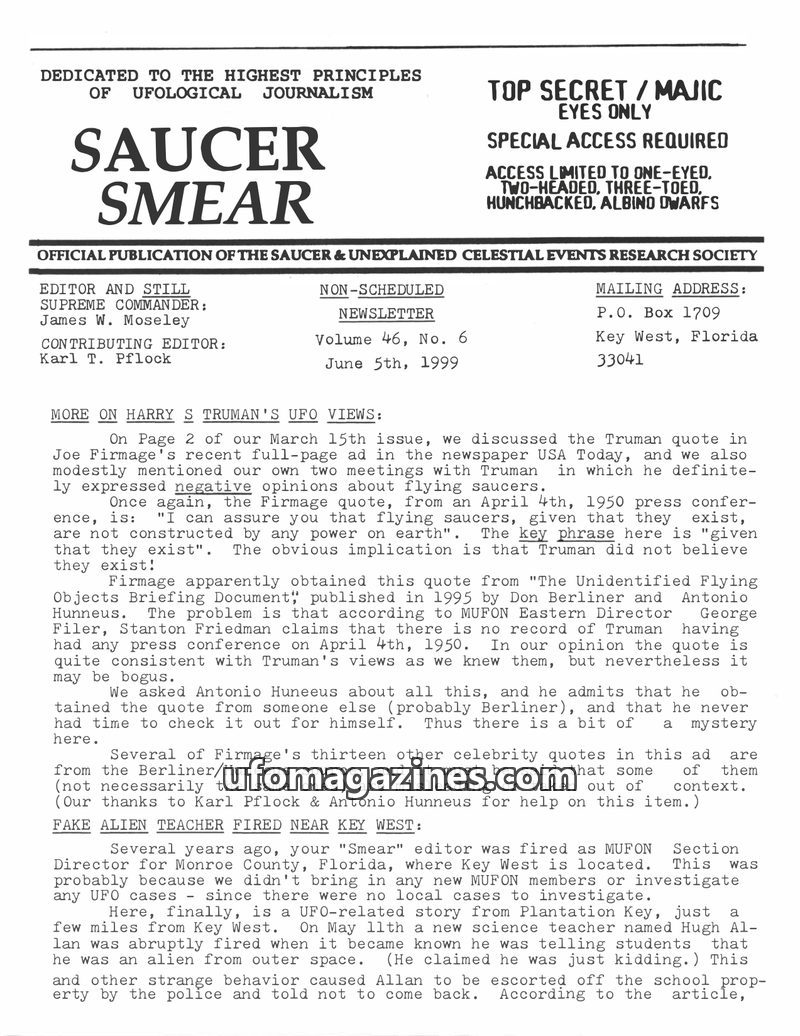 This issue of Saucer Smear, dated June 5th, 1999, delves into various UFO-related topics. It questions a quote attributed to Harry S. Truman about flying saucers, discusses a teach