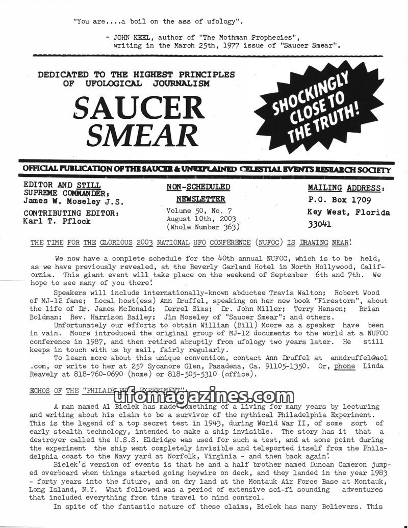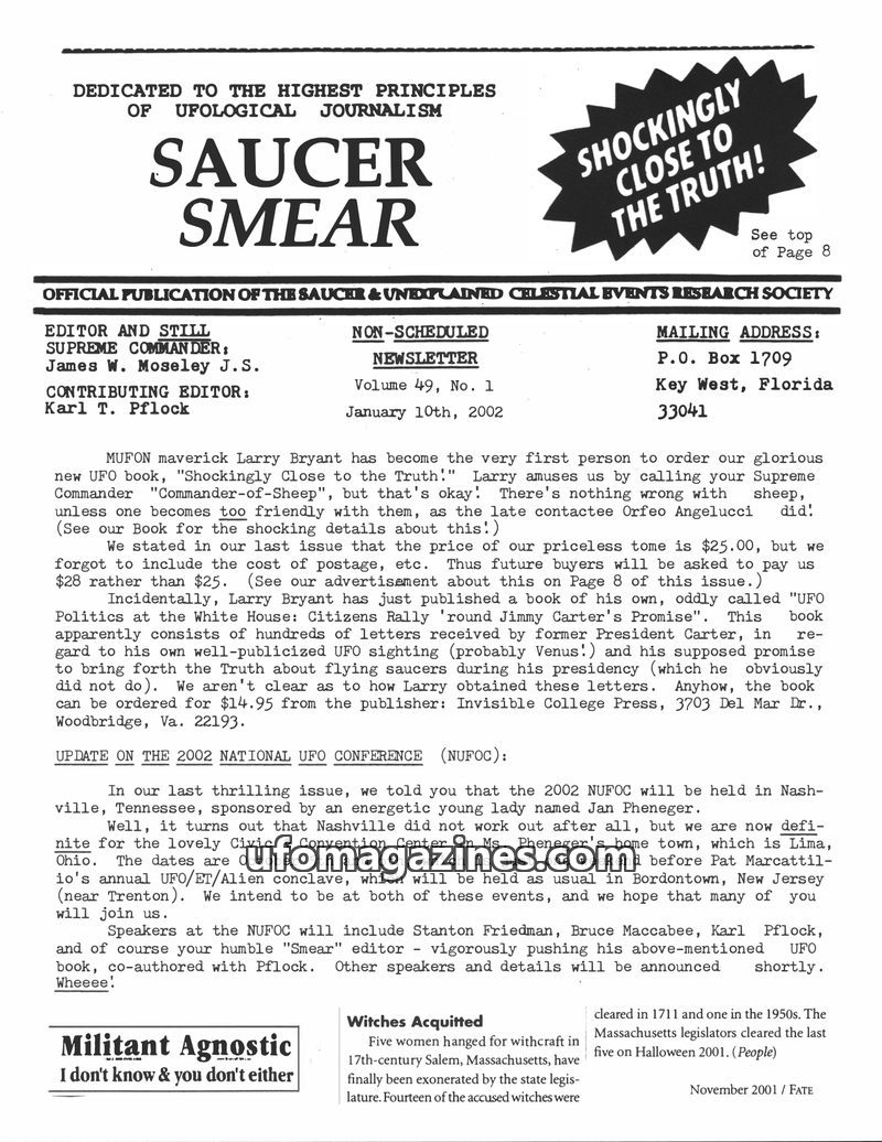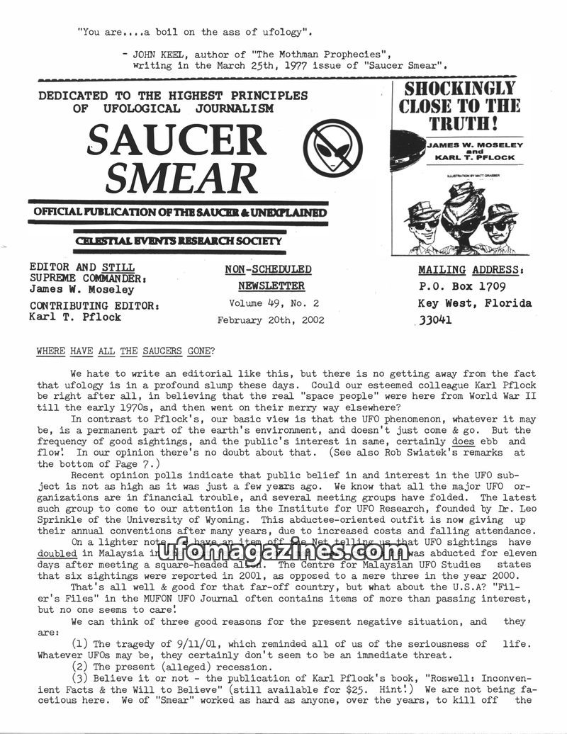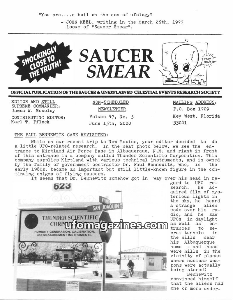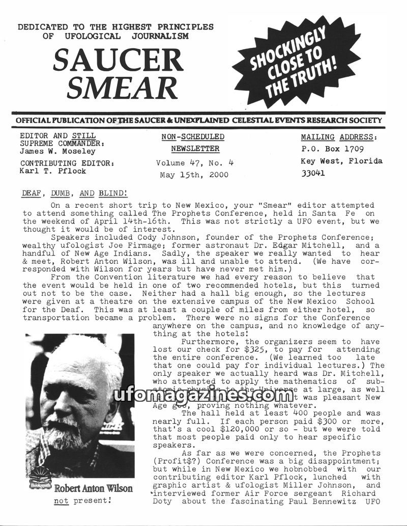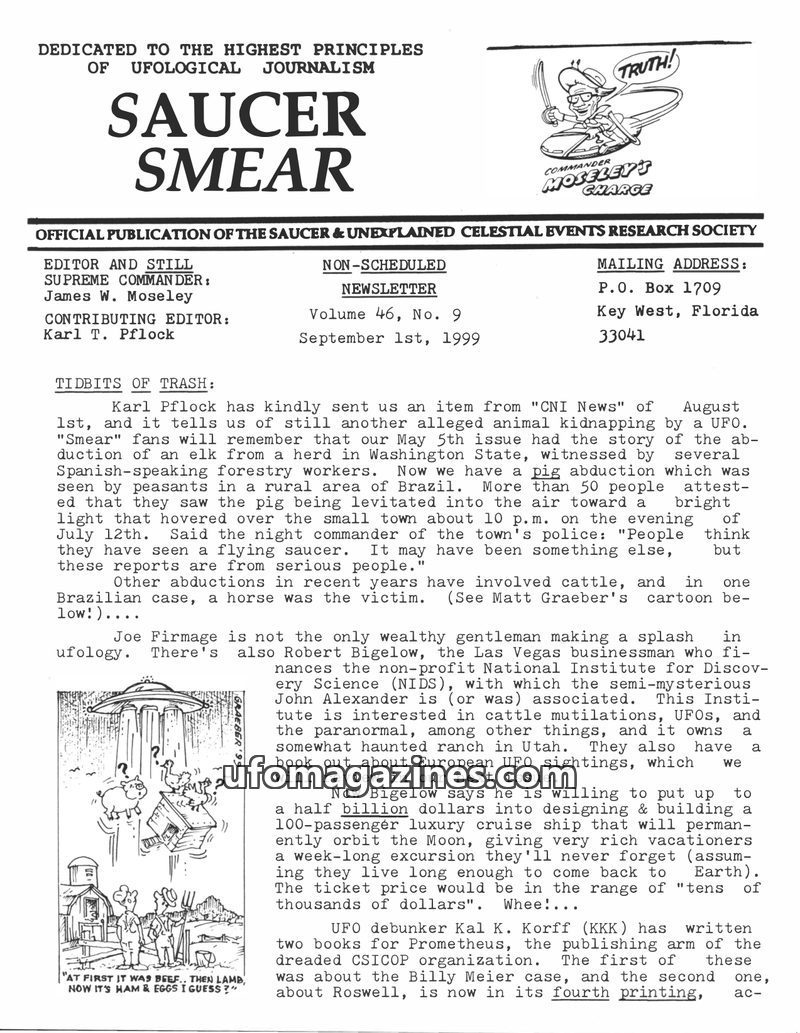 This issue of Saucer Smear covers recent alleged UFO-related animal abductions in Brazil, the business ventures of Joe Firmage and Robert Bigelow in ufology, and critiques of UFO d