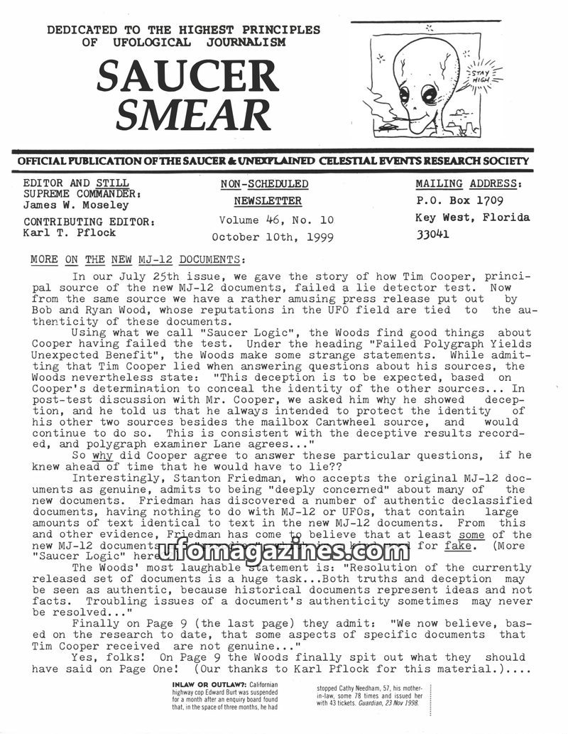This issue of Saucer Smear delves into the controversy surrounding the new MJ-12 documents, questioning their authenticity due to Tim Cooper's failed lie detector test and similari