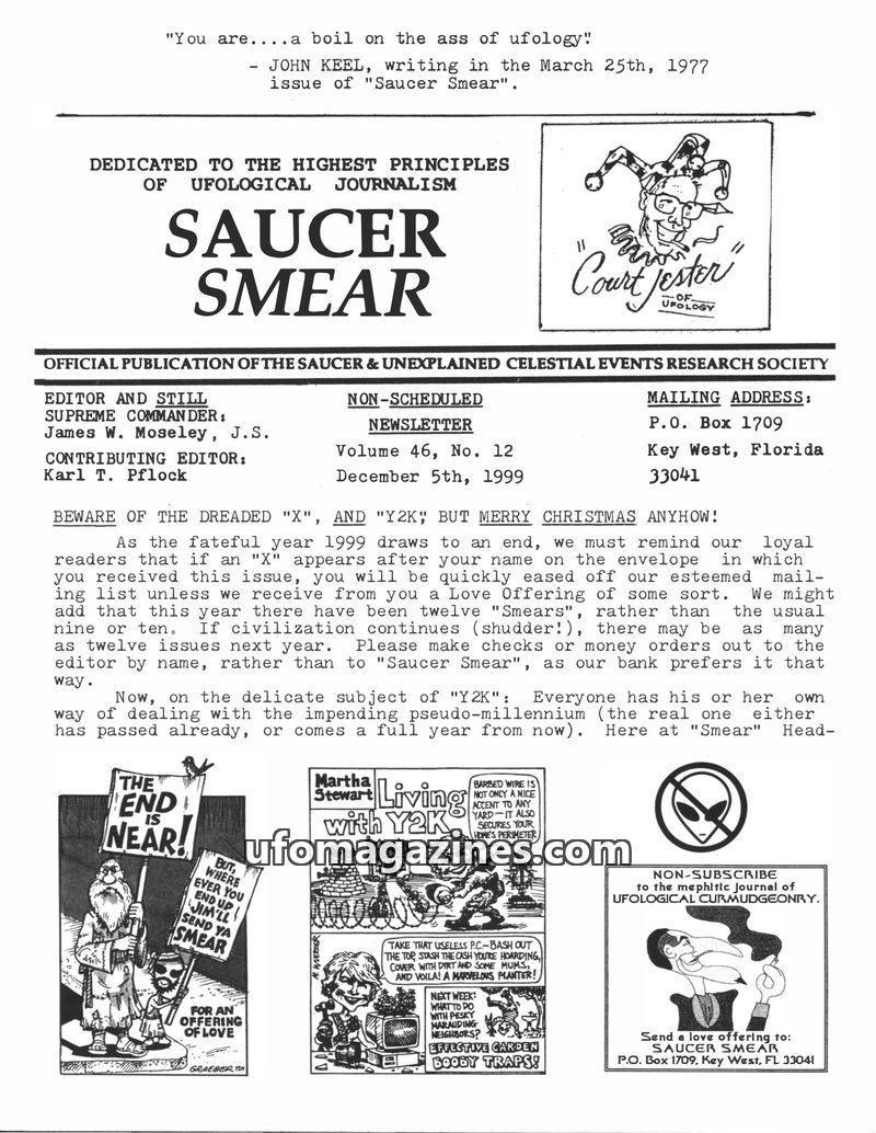 This issue of Saucer Smear, dated December 5th, 1999, addresses reader contributions, the impending Y2K millennium, and various UFO-related events and controversies. It highlights