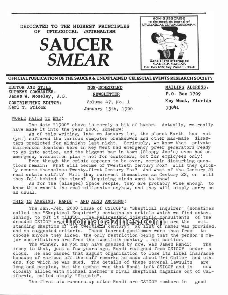 This issue of Saucer Smear, dated January 15th, 1900 (humorously), addresses the non-occurrence of the Y2K computer bug, noting that the world did not end as predicted. It features