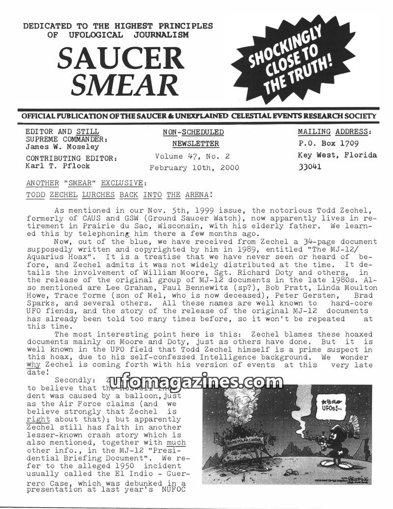This issue of Saucer Smear delves into the controversial claims of Todd Zechel regarding the MJ-12 documents, blaming others for the hoax while facing scrutiny himself. It also cov