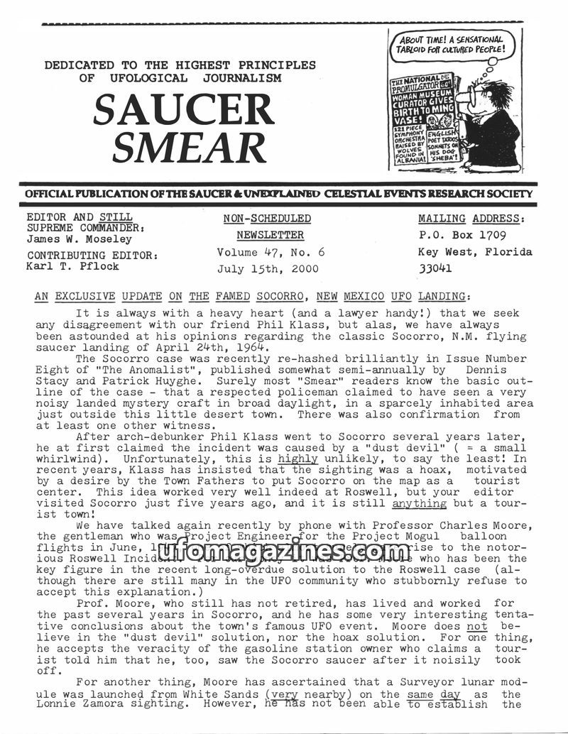 This issue of Saucer Smear focuses on the Socorro, New Mexico UFO landing of April 24, 1964, re-examining the case and challenging Phil Klass's 'dust devil' and hoax theories. Prof