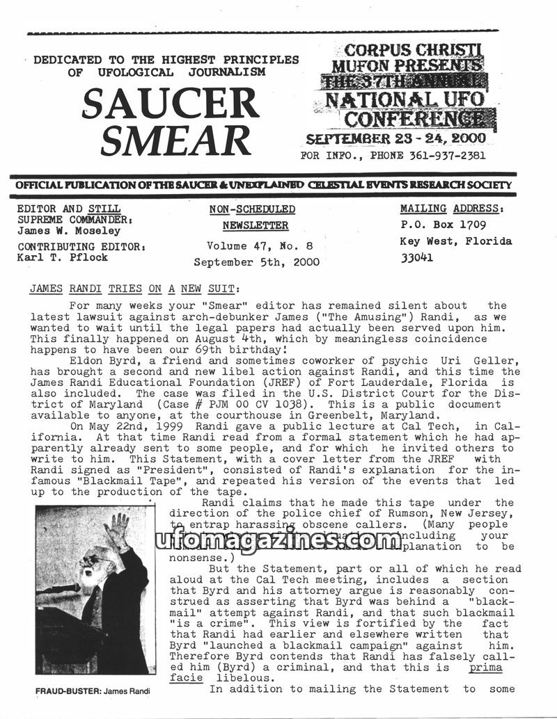 This issue of Saucer Smear details a libel lawsuit filed by Eldon Byrd against arch-debunker James Randi and the James Randi Educational Foundation. It also covers internal MUFON c