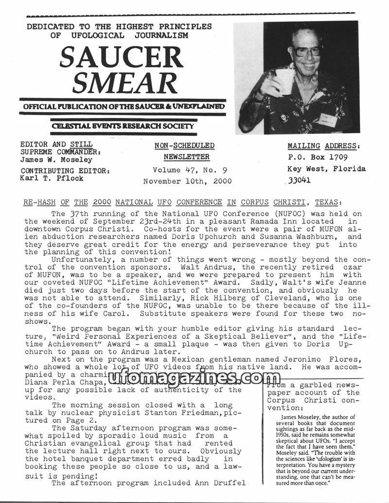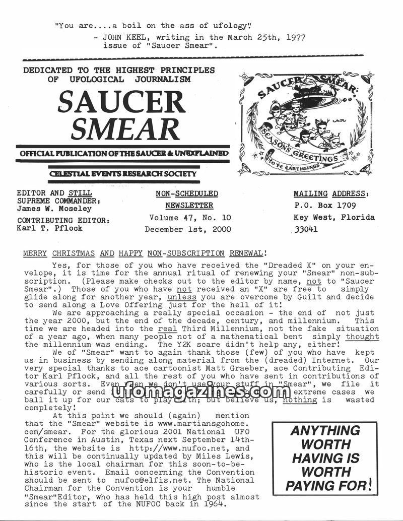 This issue of Saucer Smear, dated December 1, 2000, announces subscription renewals and thanks contributors. It covers reports from two UFO conventions: one in Bordontown, NJ, feat