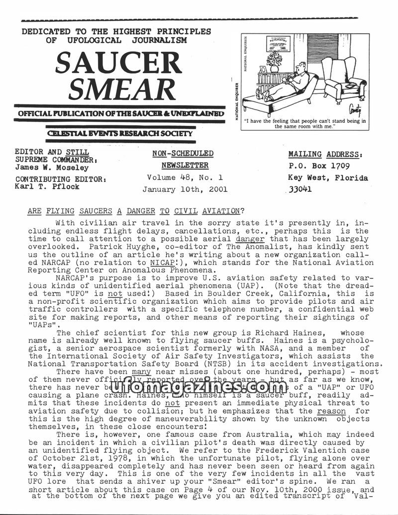 This issue of Saucer Smear focuses on the potential danger of Unidentified Aerial Phenomena (UAP) to civil aviation, highlighting the new organization NARCAP. It revisits the Frede