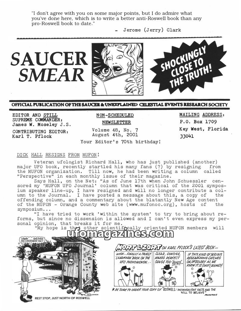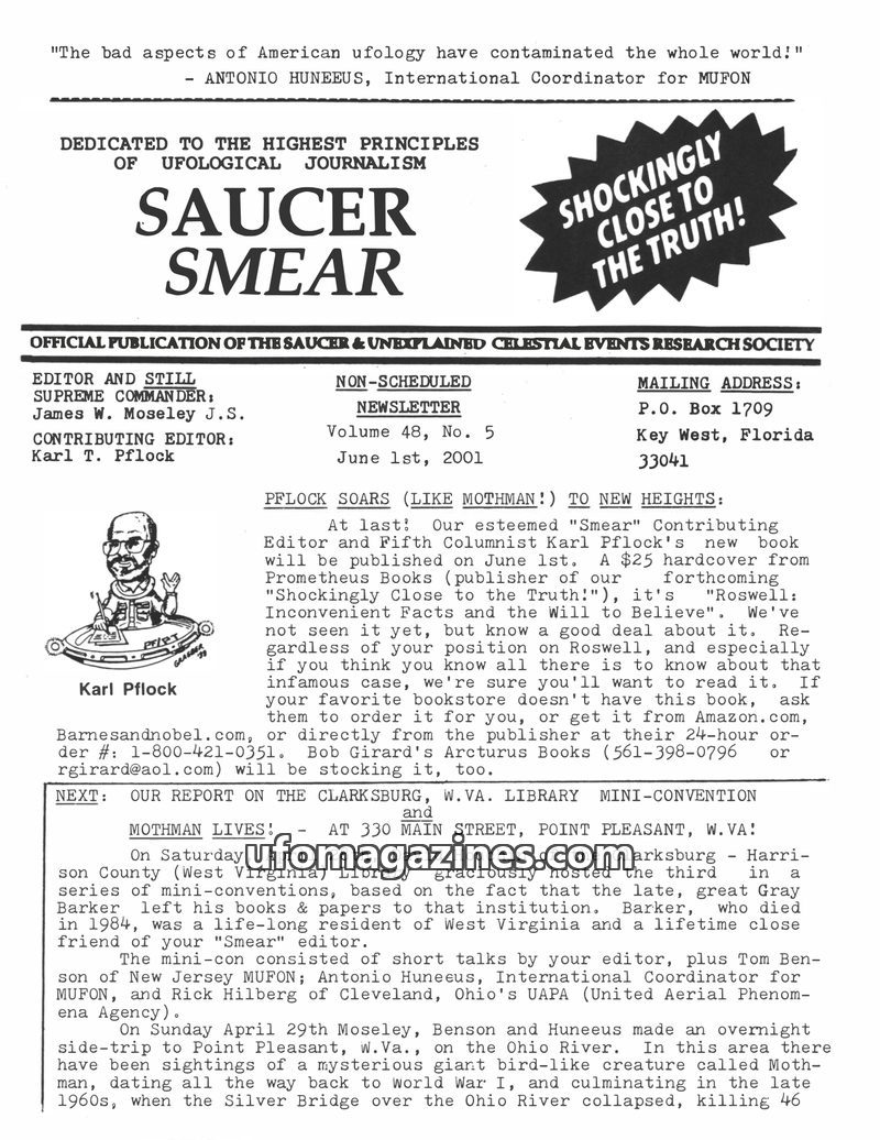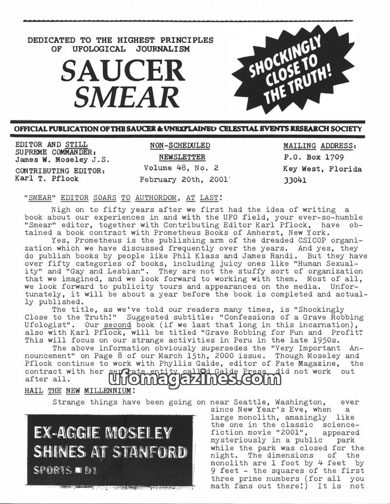 The January 2001 issue of Saucer Smear announces a book contract for editor James W. Moseley and contributing editor Karl T. Pflock with Prometheus Books. It discusses the mysterio
