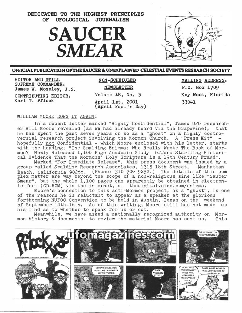 This issue of Saucer Smear reports on UFO researcher Bill Moore's involvement in a project questioning the authenticity of the Book of Mormon. It also criticizes MUFON for alleged