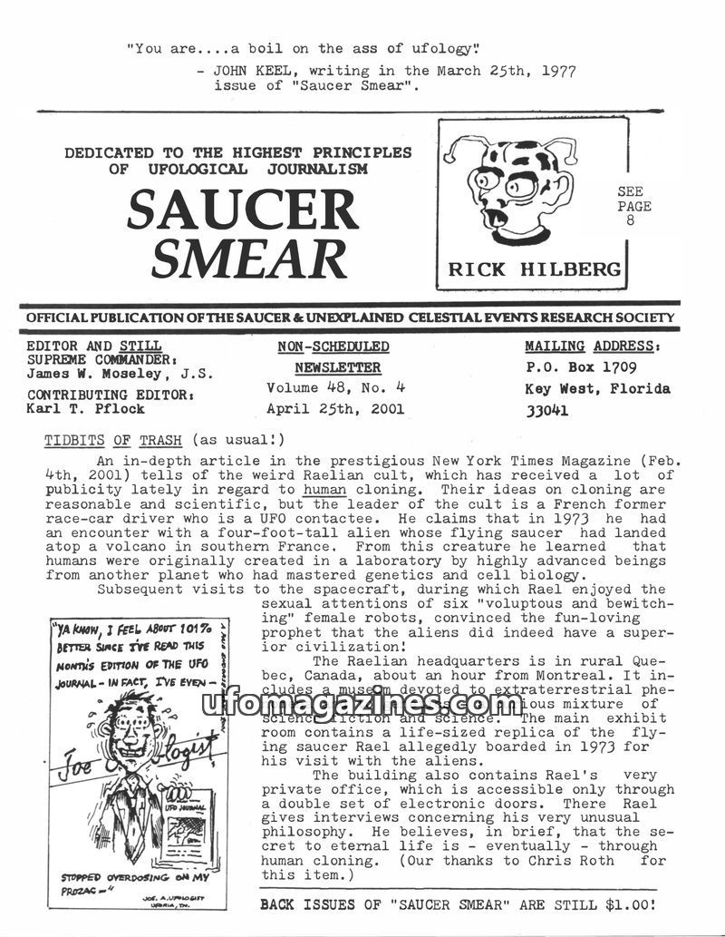 This issue of Saucer Smear covers the fizzled Raelian cloning story, questioning its authenticity and motives. It delves into the credibility of Walter Haut regarding the Roswell i