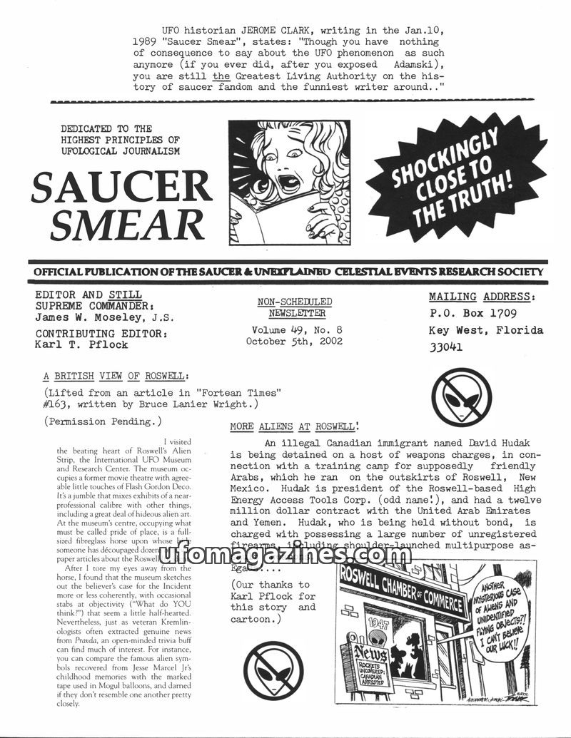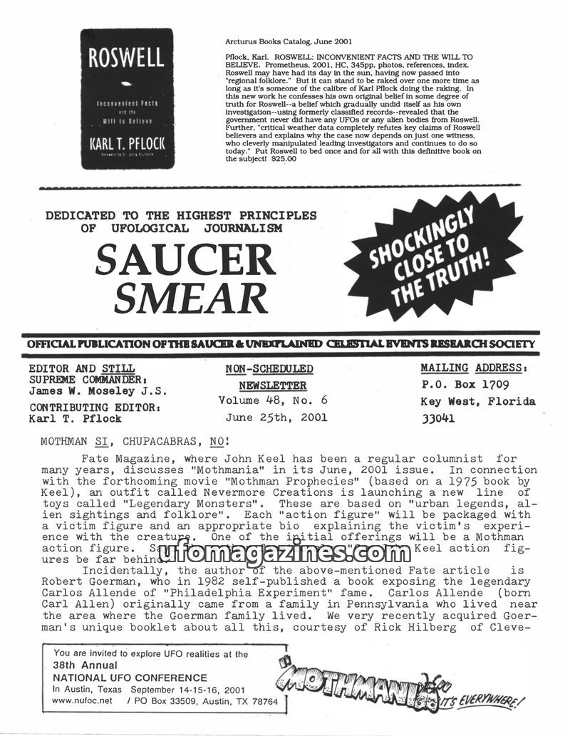 This issue of Saucer Smear announces Karl Pflock's new book 'Roswell: Inconvenient Facts and the Will to Believe'. It reports on a mini-convention in Clarksburg, West Virginia, and