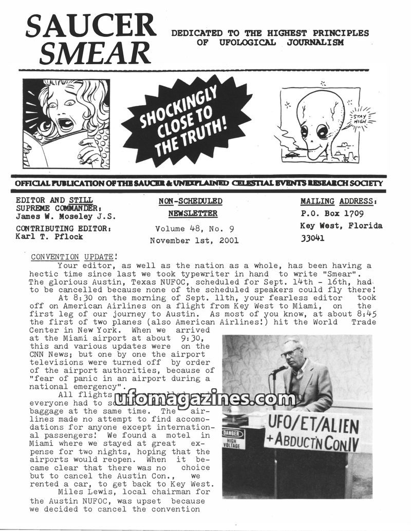 The November 1, 2001 issue of Saucer Smear details the cancellation of the Austin NUFOC convention due to the September 11th attacks, impacting travel and speaker availability. It