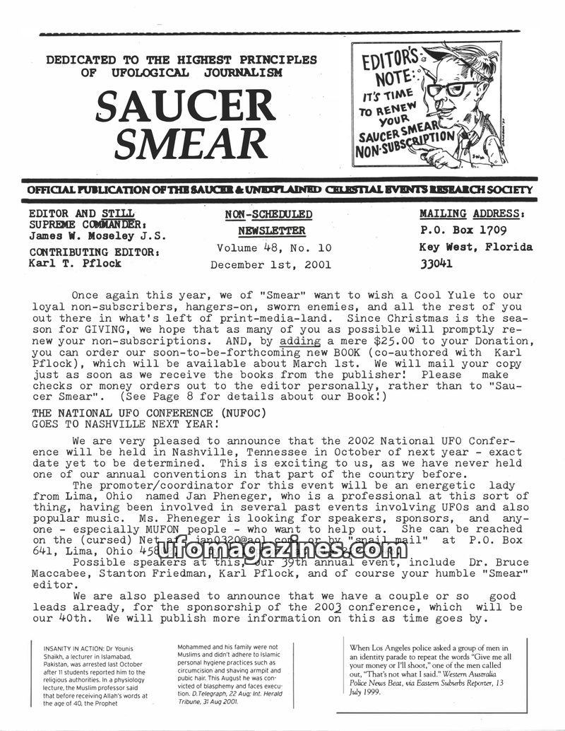 This issue of Saucer Smear, dated January 10, 2002, covers various UFO-related topics. It includes an update on the 2002 National UFO Conference (NUFOC) being held in Lima, Ohio, a