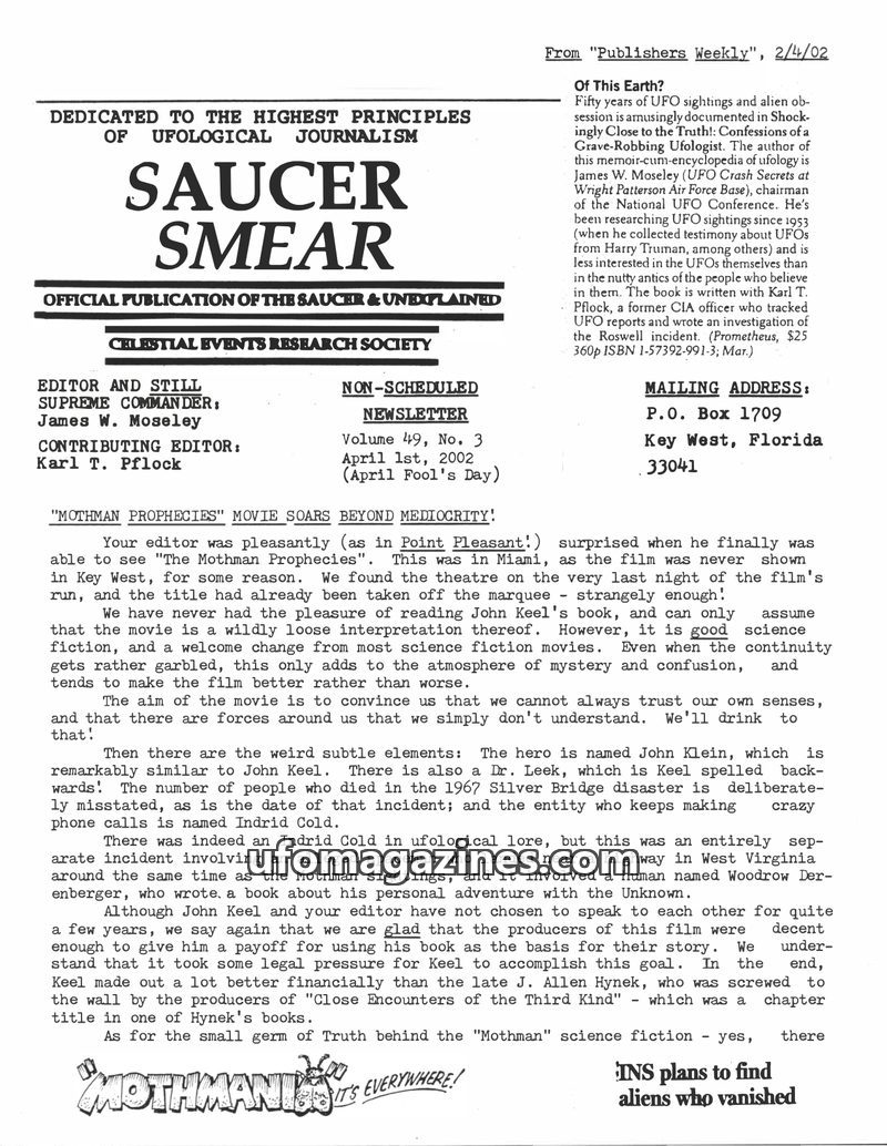 This issue of Saucer Smear, dated April 1, 2002, focuses heavily on the movie 'The Mothman Prophecies', with multiple contributors offering their opinions and relating it to the or