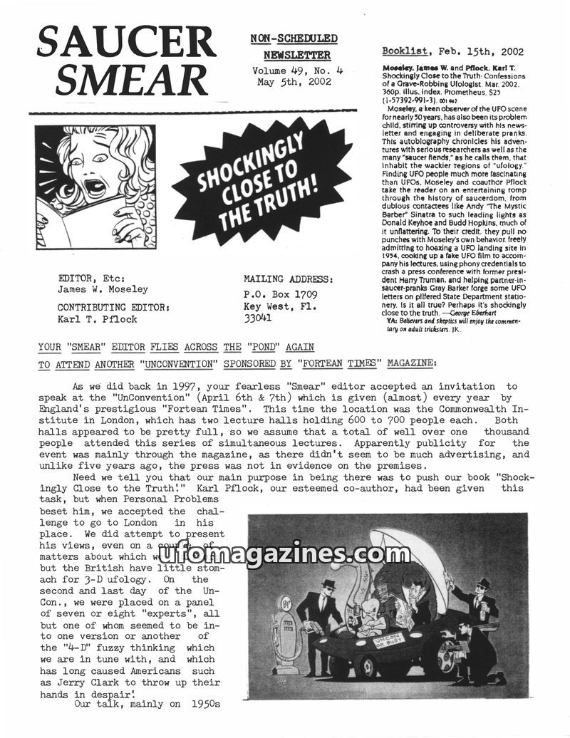This issue of Saucer Smear covers the editor's trip to the 'UnConvention' in London, sponsored by Fortean Times, where he promoted his book 'Shockingly Close to the Truth!'. It inc