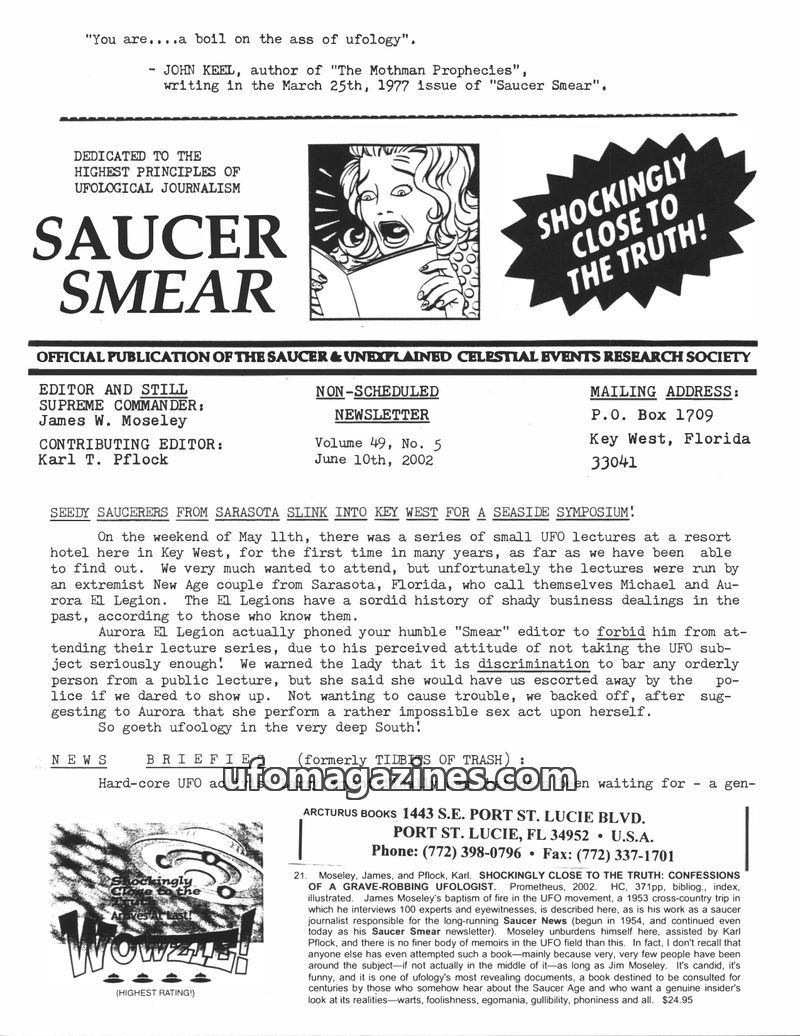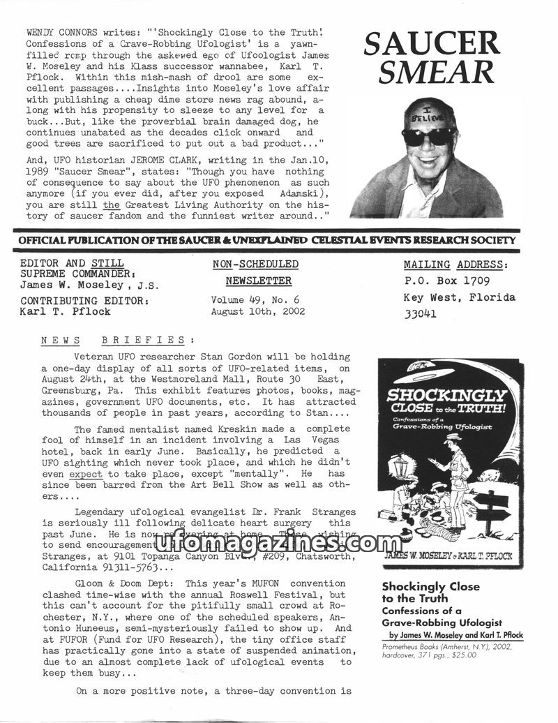 This issue of 'Saucer Smear' reviews James W. Moseley and Karl T. Pflock's book 'Shockingly Close to the Truth!', offering critiques from Wendy Connors and Jerome Clark. It include