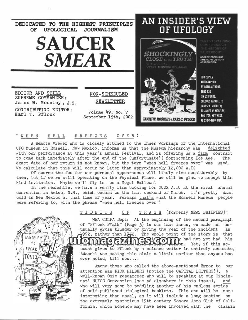 This issue of Saucer Smear from September 2002 features an editorial by James W. Moseley criticizing the seriousness of American ufology. It includes a review of the movie 'Signs',