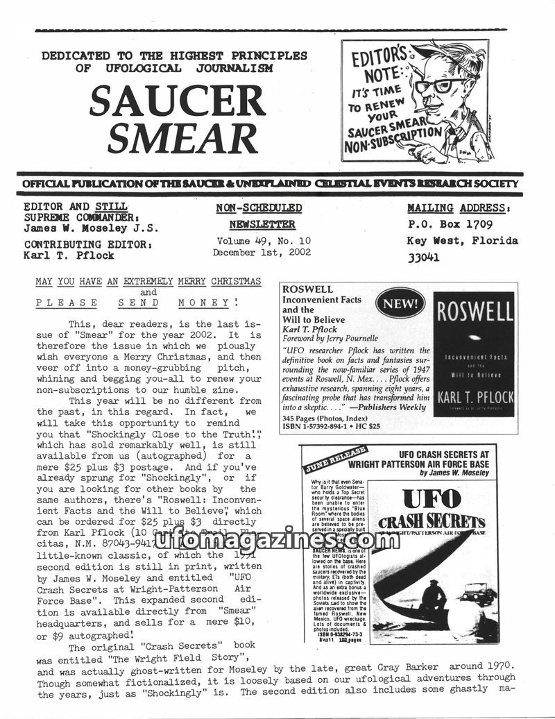 This issue of Saucer Smear, dated December 1st, 2002, serves as the final issue of the year and includes a plea for subscription renewals. It highlights new books on Roswell and UF