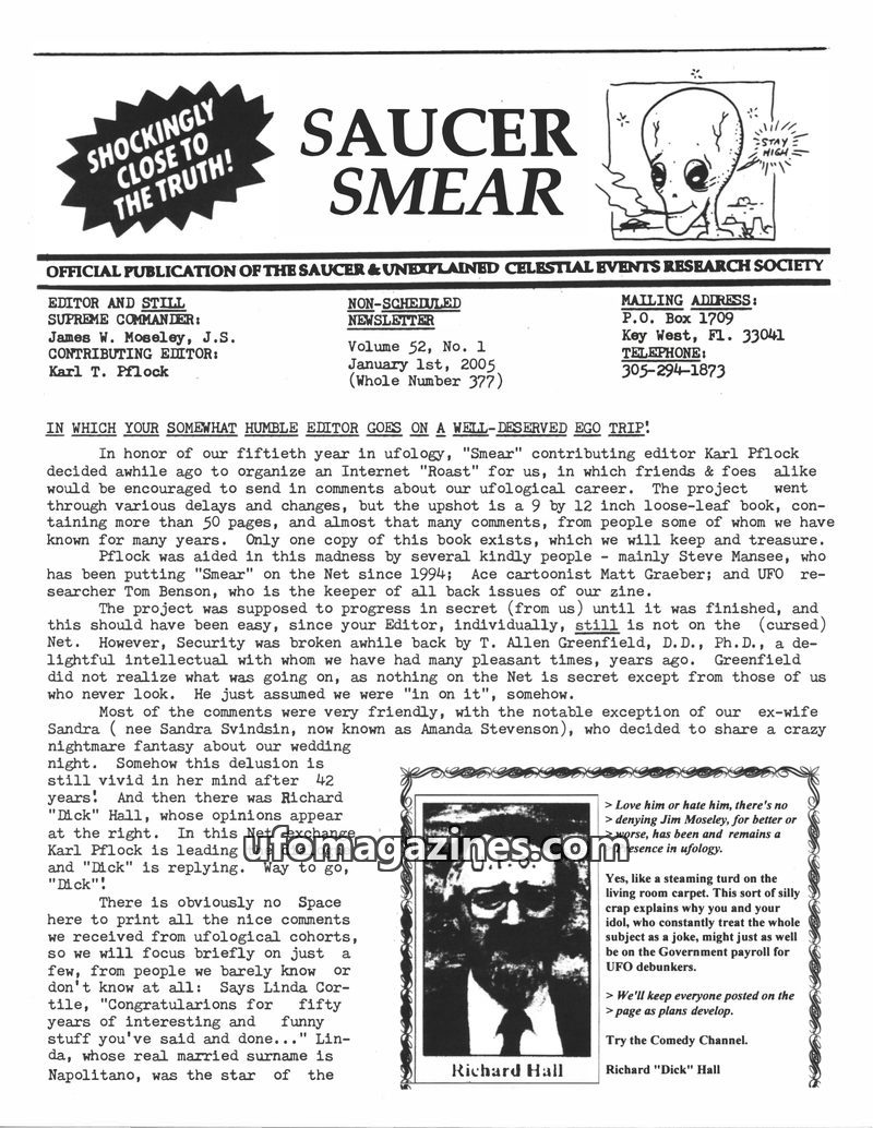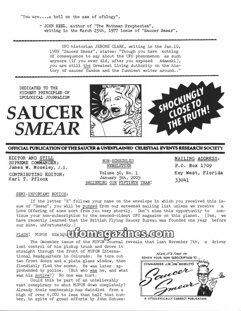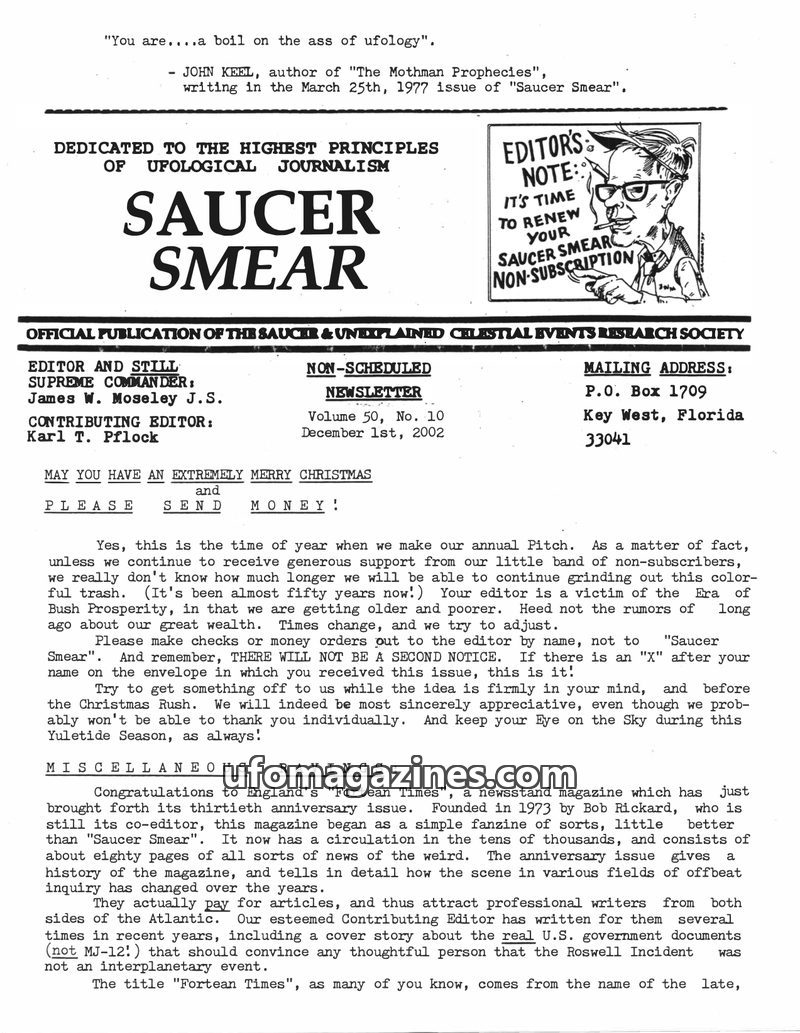 This issue of Saucer Smear celebrates its 50th year with a 'roast' of editor James W. Moseley, featuring comments from friends and foes. It delves into the legacy of Charles Fort,