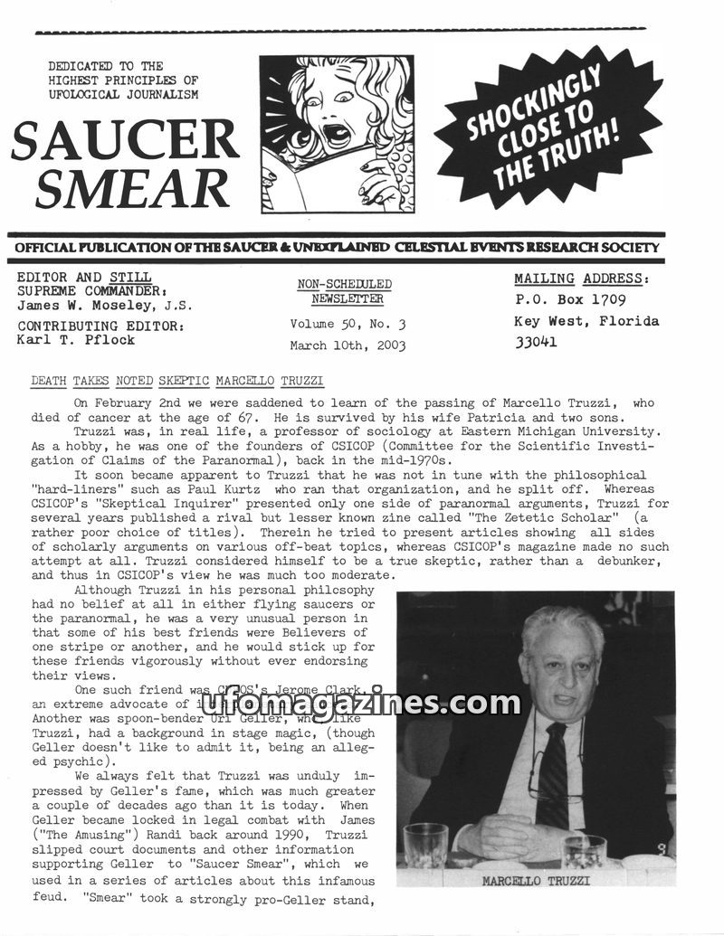 This issue of Saucer Smear, dated March 10, 2003, reports the death of Marcello Truzzi, a sociology professor and founder of CSICOP, known for his balanced approach to paranormal c