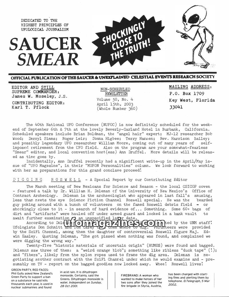 This issue of Saucer Smear features a review of Karl Pflock's book 'Roswell: Inconvenient Facts and the Will to Believe,' which disputes the Roswell alien crash narrative. It also