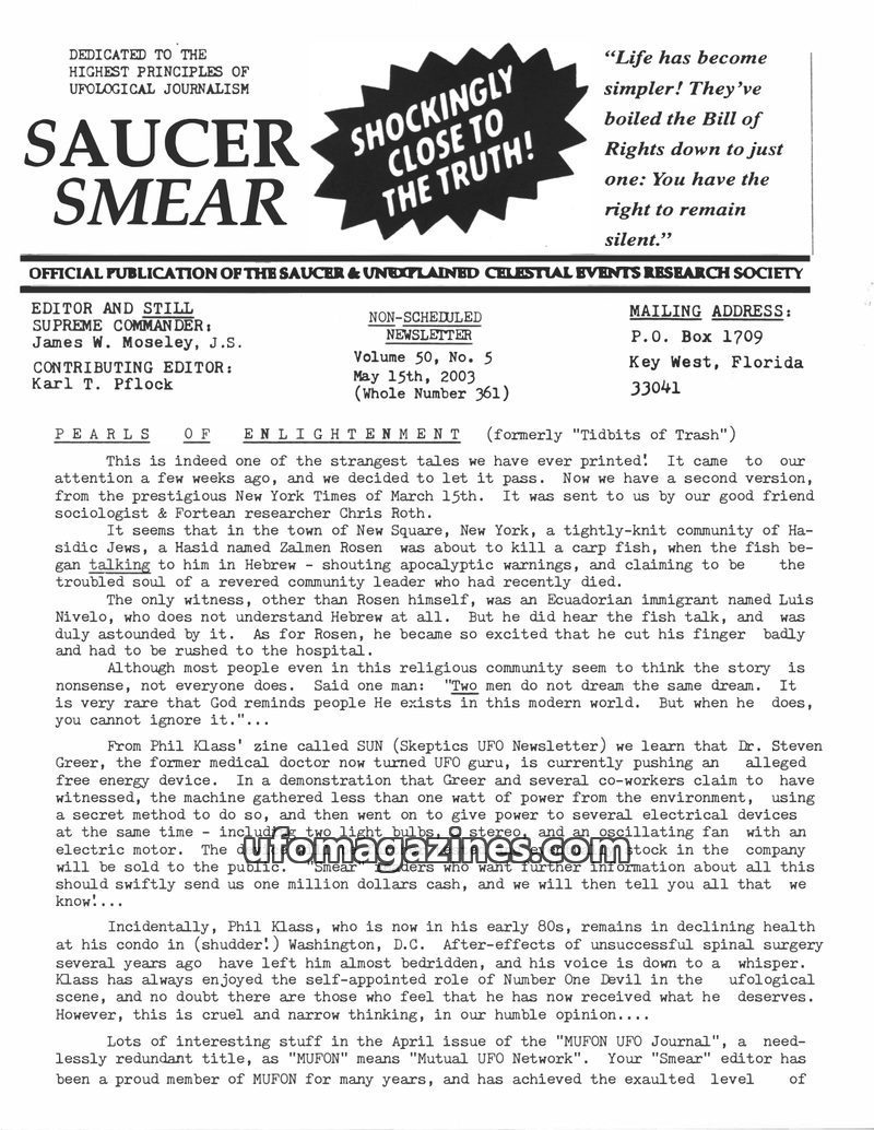 This issue of Saucer Smear covers a variety of unusual topics, including a fish that allegedly spoke Hebrew, a free energy device demonstration, and a critique of MUFON's current p