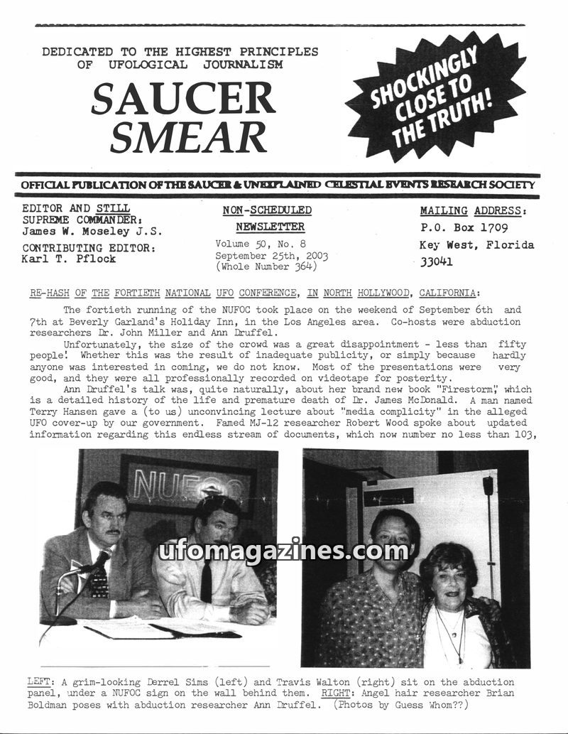 This issue of Saucer Smear covers the upcoming 40th annual National UFO Conference (NUFOC) in North Hollywood, California, with a schedule of speakers including Travis Walton and R