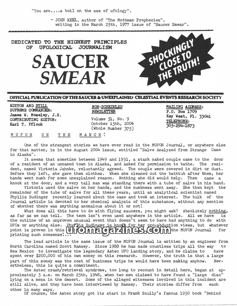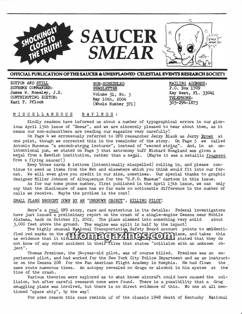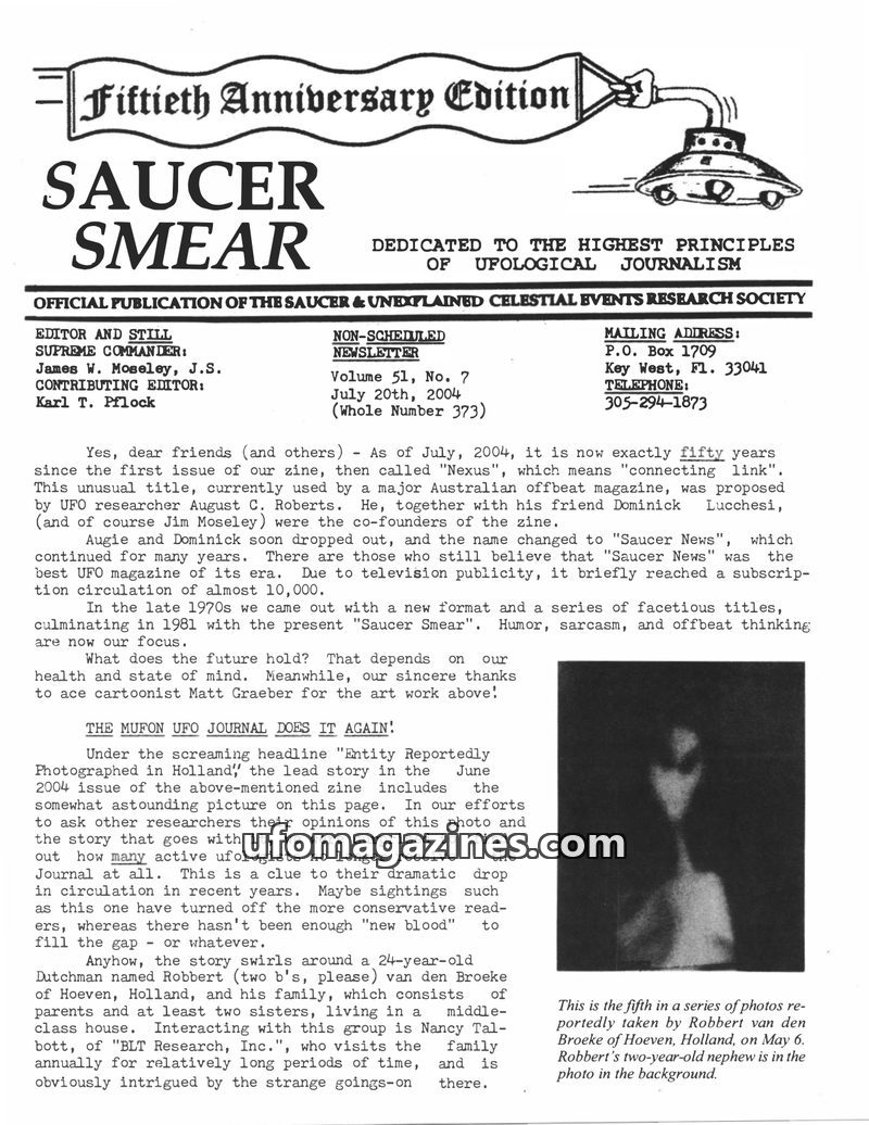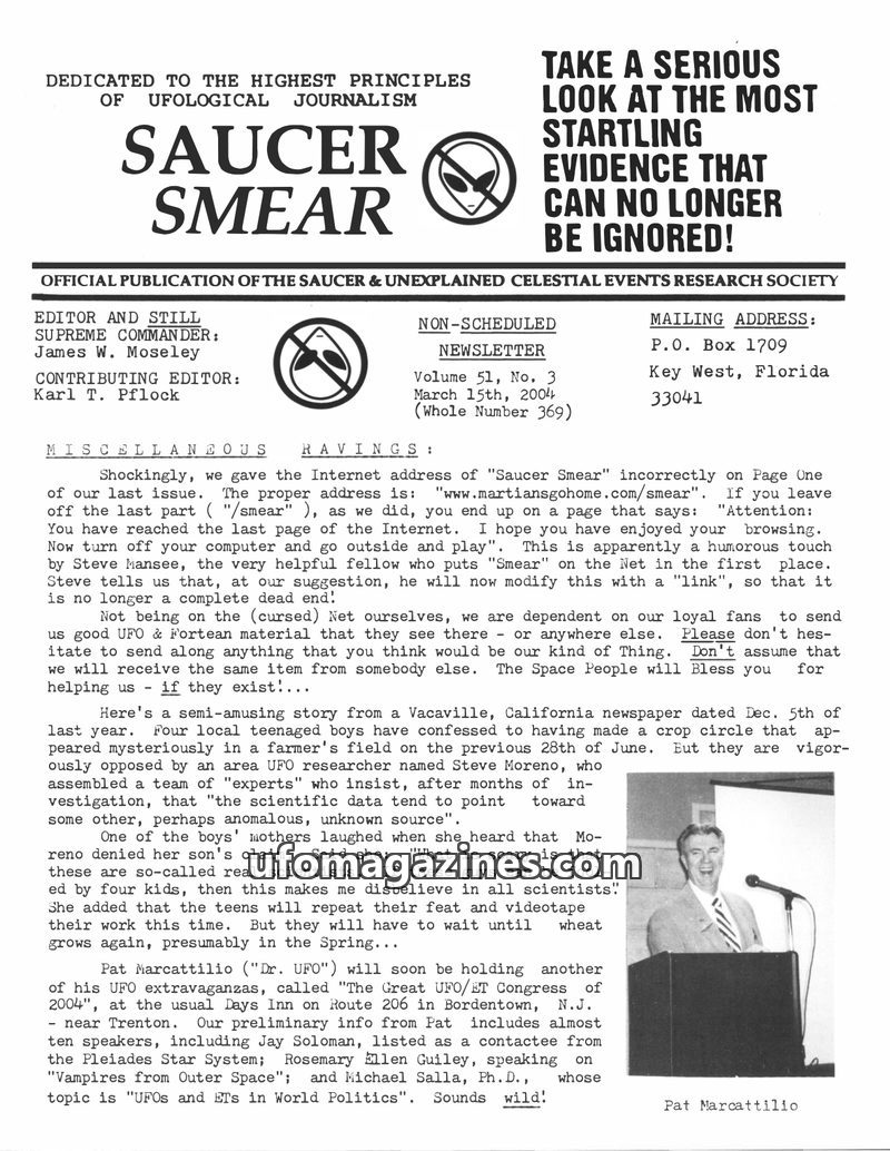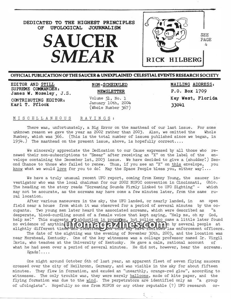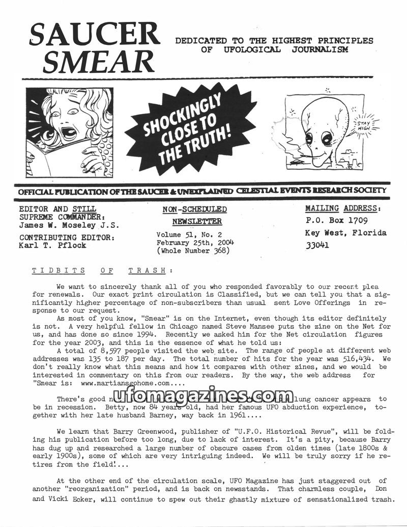 This issue of Saucer Smear, dated February 25, 2004, provides a critical look at the ufology field. It reports on the net circulation of the magazine, the recession of Betty Hill's