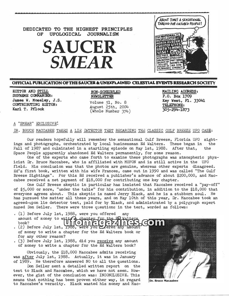 This issue of Saucer Smear focuses on the Gulf Breeze UFO case, detailing a lie detector test taken by Dr. Bruce Maccabee concerning his involvement and alleged payment for contrib