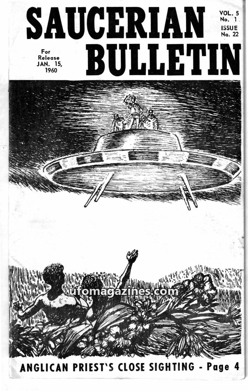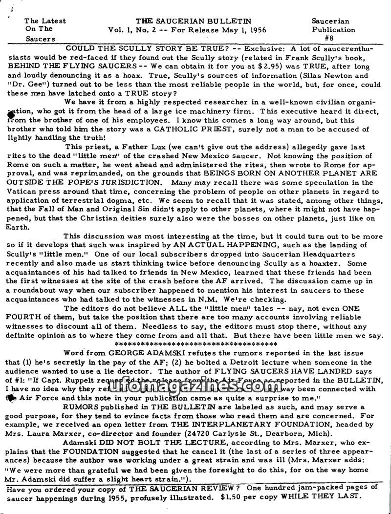 This issue of The Saucerian Bulletin explores the controversial Scully story about 'little men' from a crashed saucer, presenting a possible connection to a Catholic priest's accou