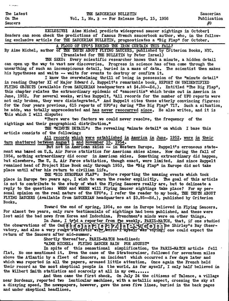 This issue features an exclusive article by Aime Michel predicting a 'Big Flap' of UFO sightings for October 1956, based on his analysis of the 1954 European sightings. He argues t