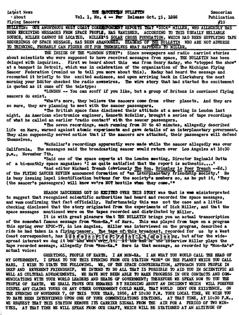 This issue of The Saucerian Bulletin reports the disappearance of Dick Miller, a West Coast correspondent who allegedly received messages from space. It details the 'London Story'
